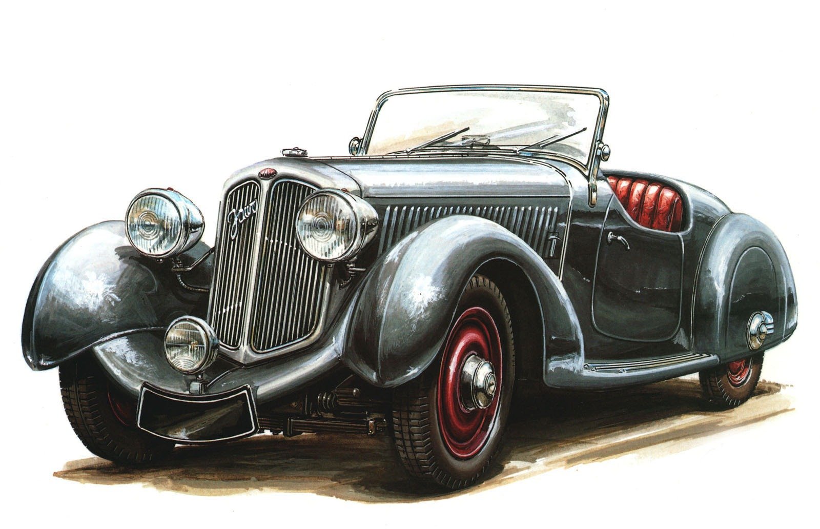 White Alfa Romeo against the wall with a picture of a steam locomotive