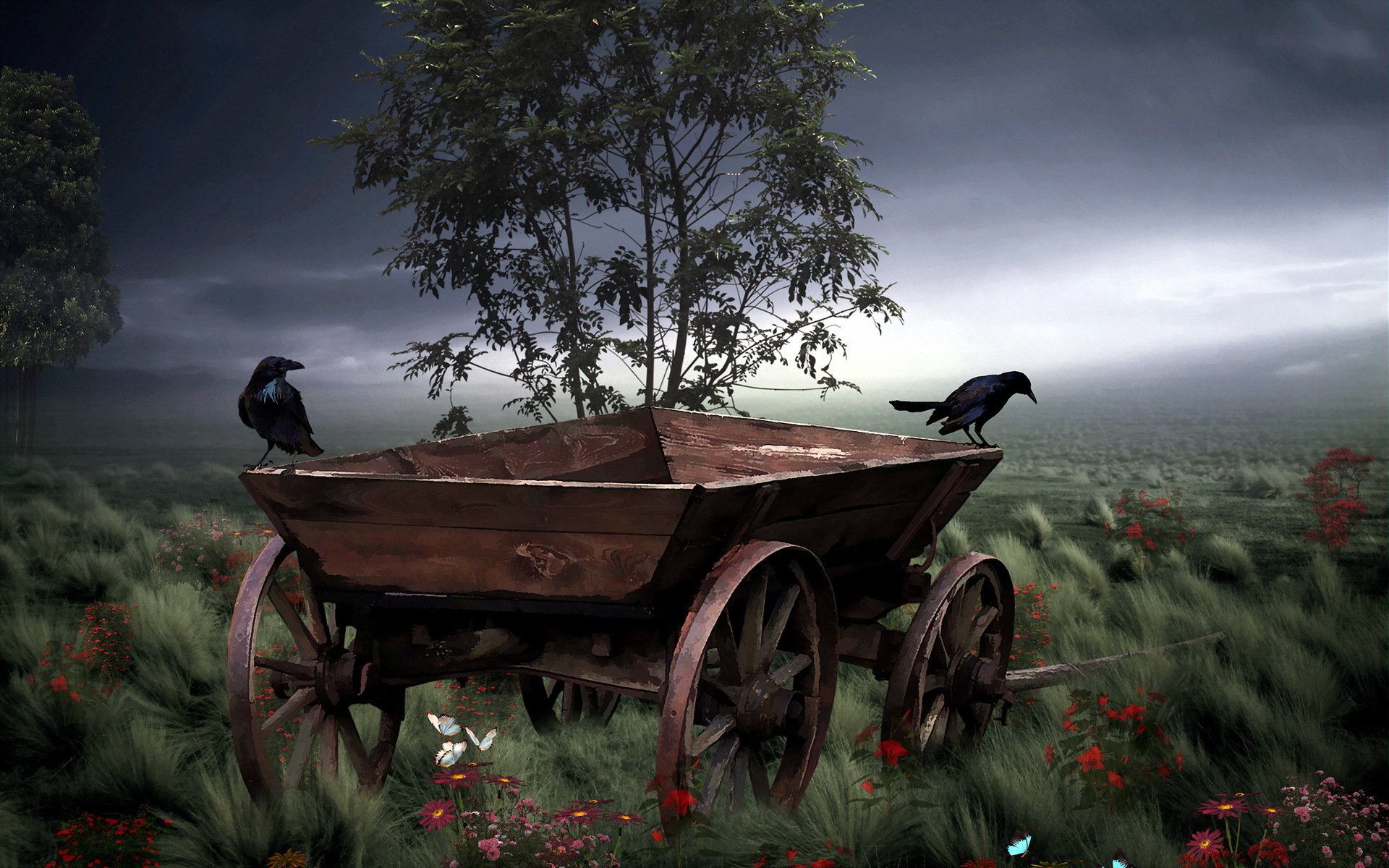 Two crows are sitting on a cart