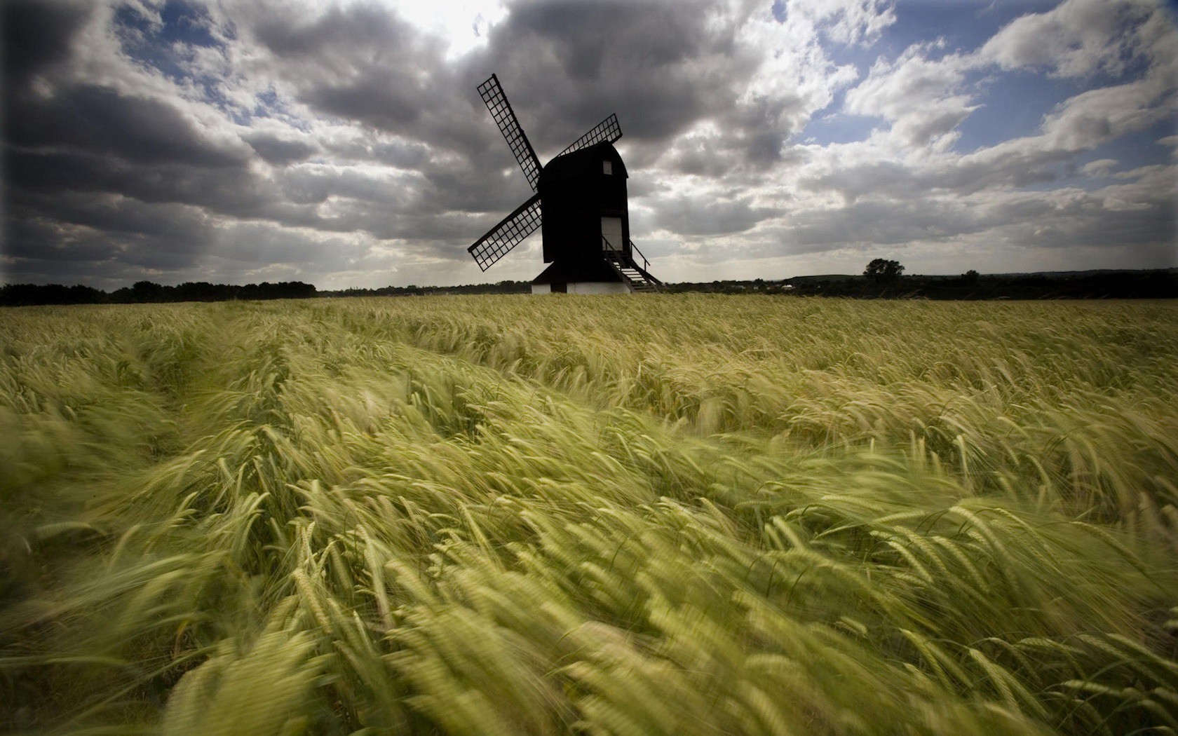 Windmills on a cloudy day against a rainbow background