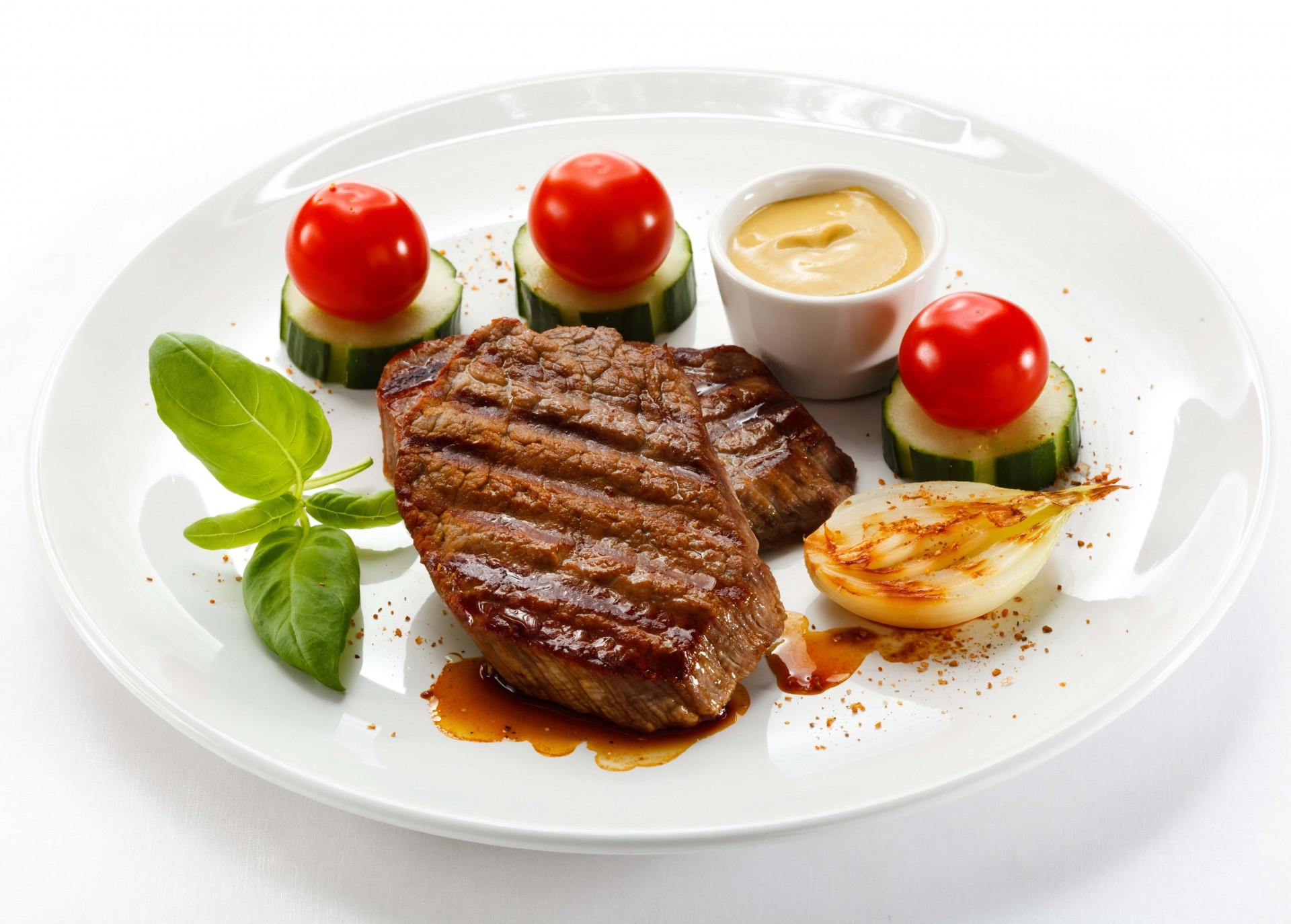 Chop with herbs and onions on a white background