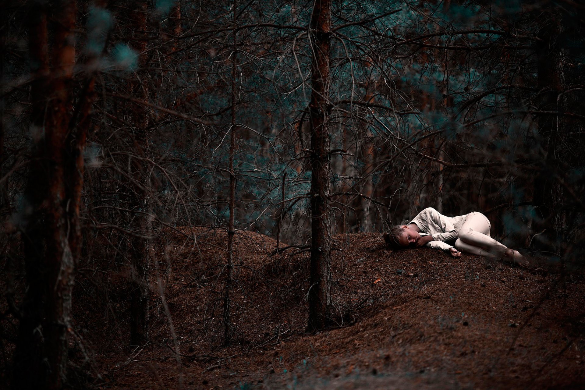 Forest, thicket, pine trees girl sleeping