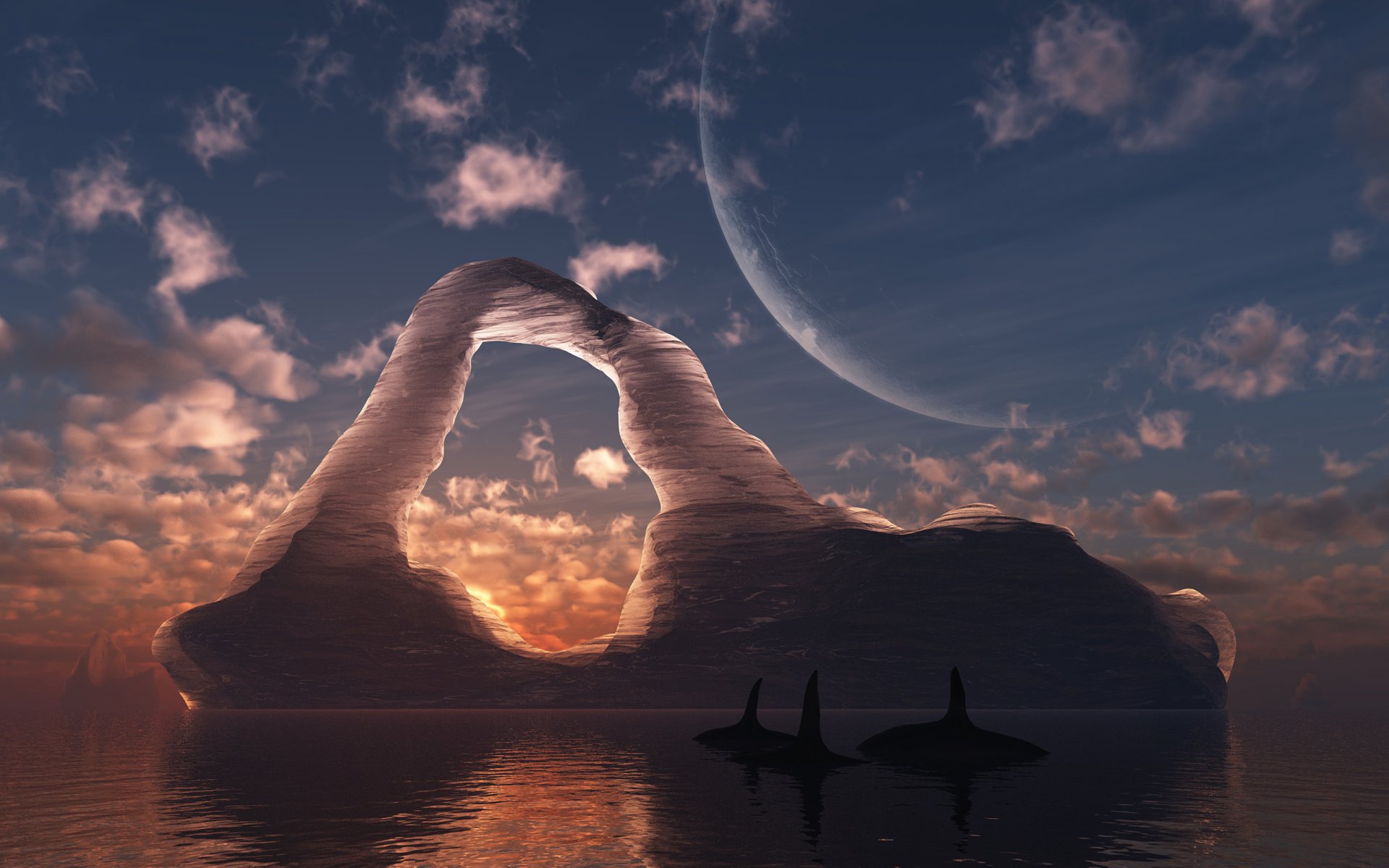 Whales swimming past an iceberg in the shape of an arch