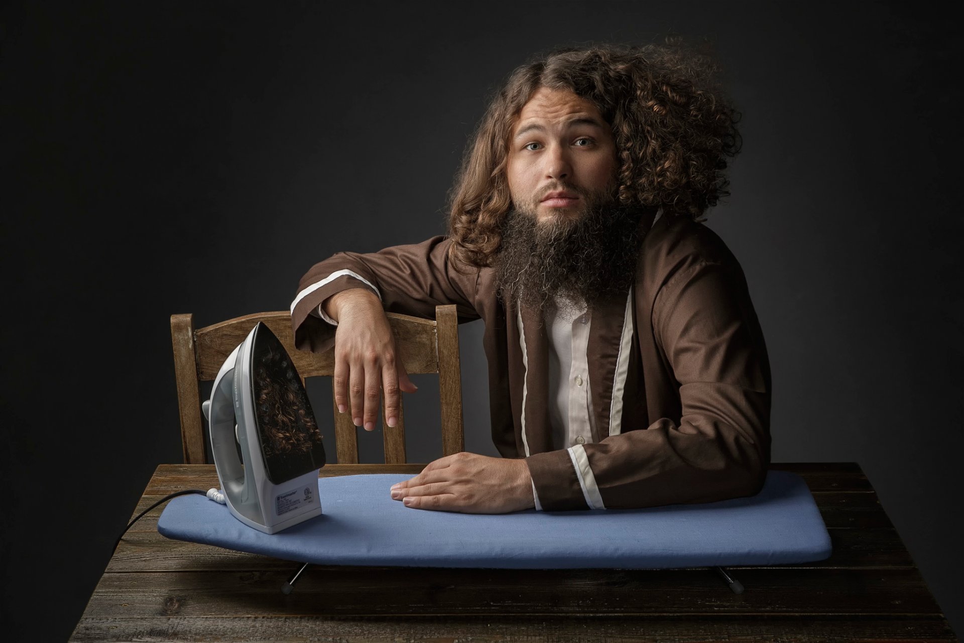 Curly-haired girl with blush on her cheeks on a multicolored cloudy background