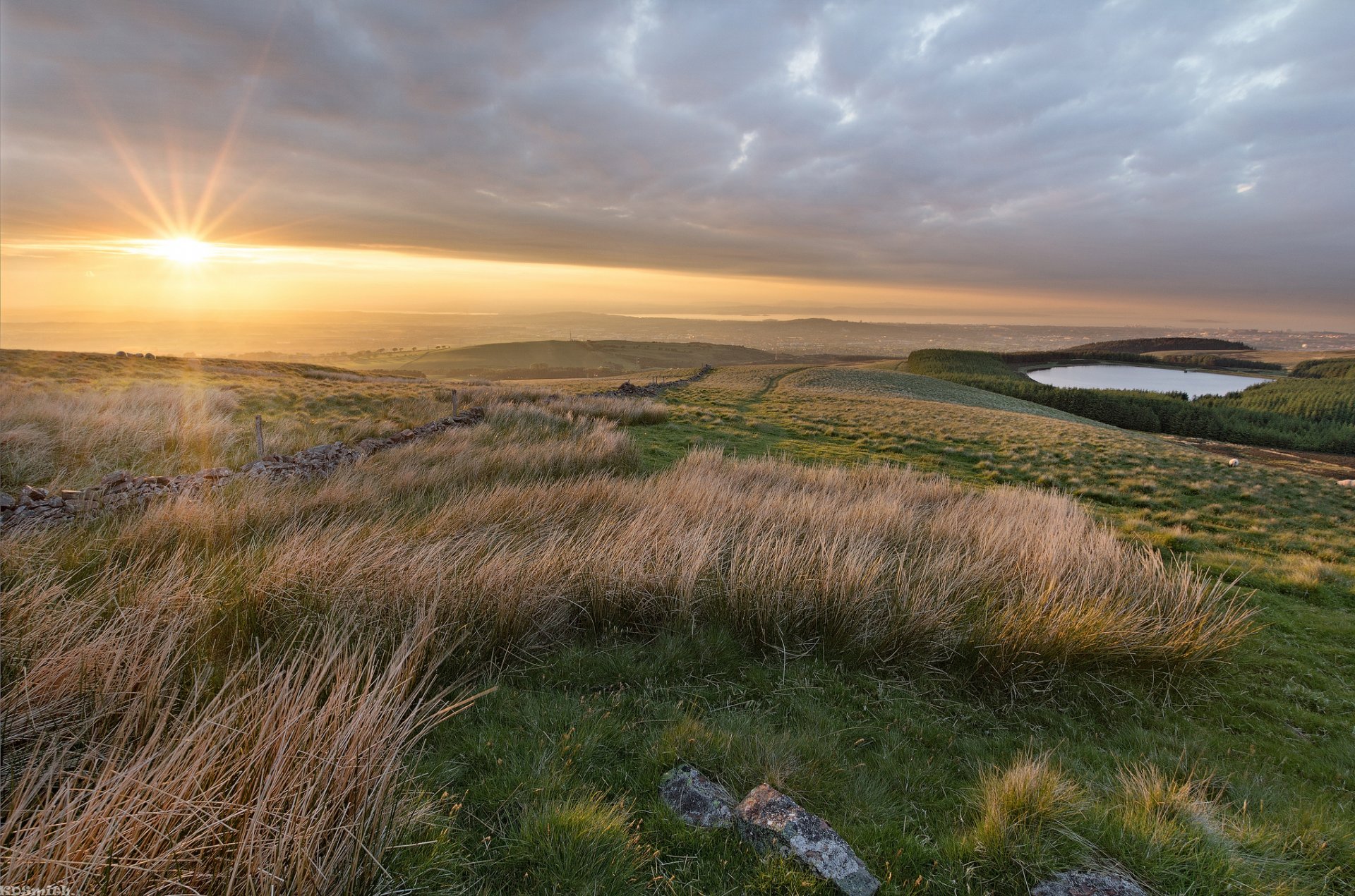 Dawn over green hills and houses