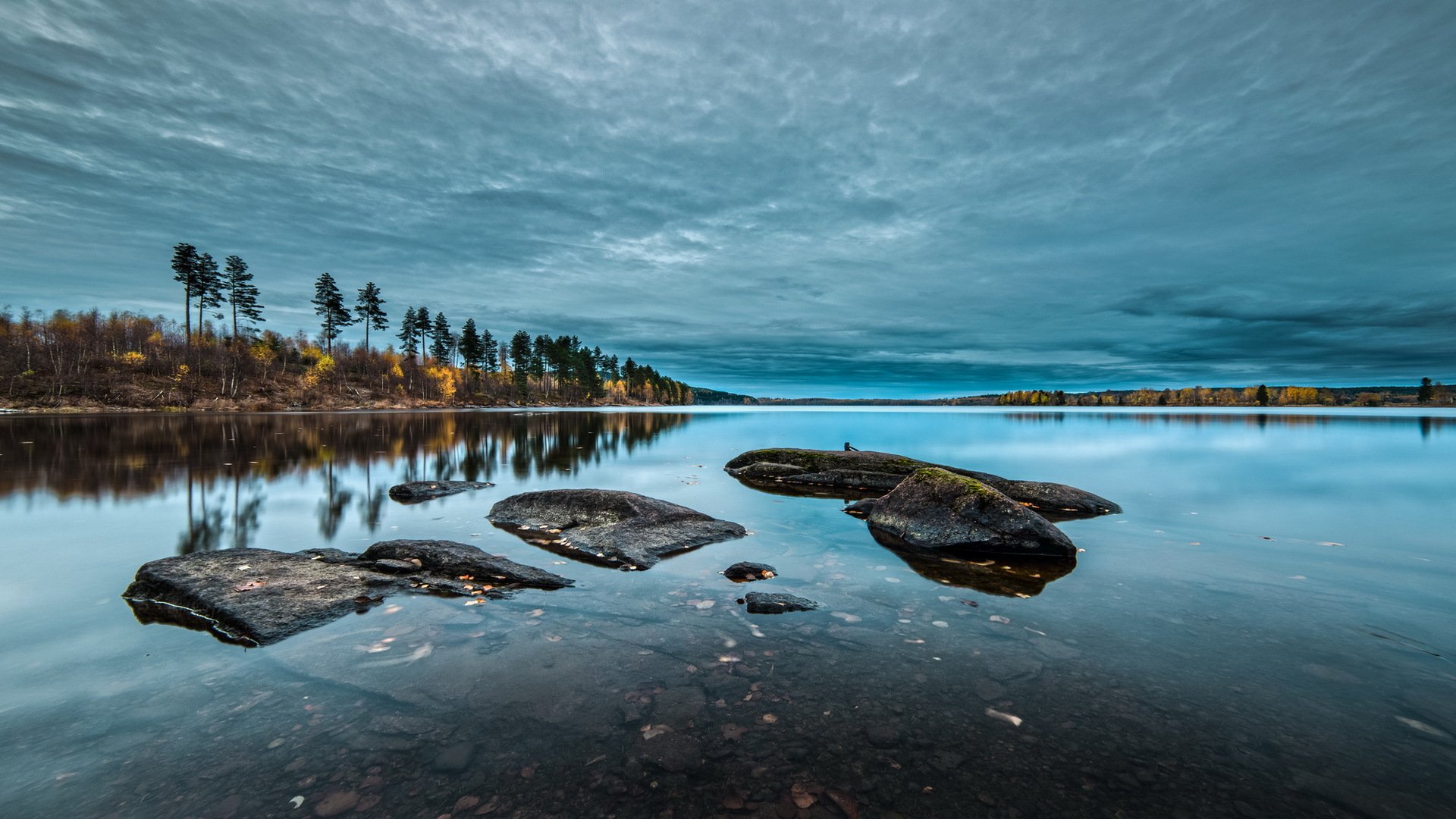 A naked girl with wet long hair lies in the water on a blurry background of green shore and blue sky