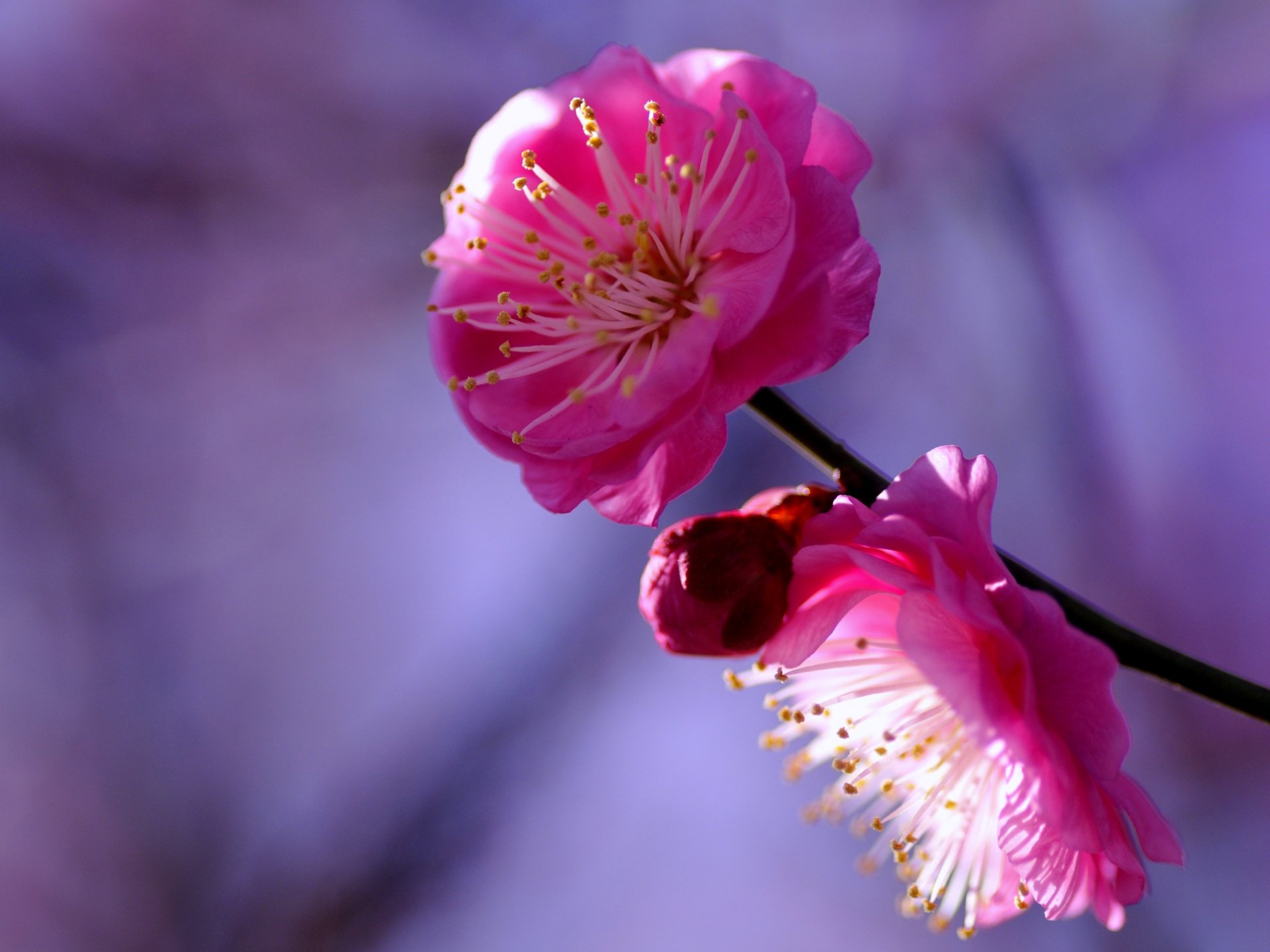 A twig with a pink flower, a bud of crimson flowers