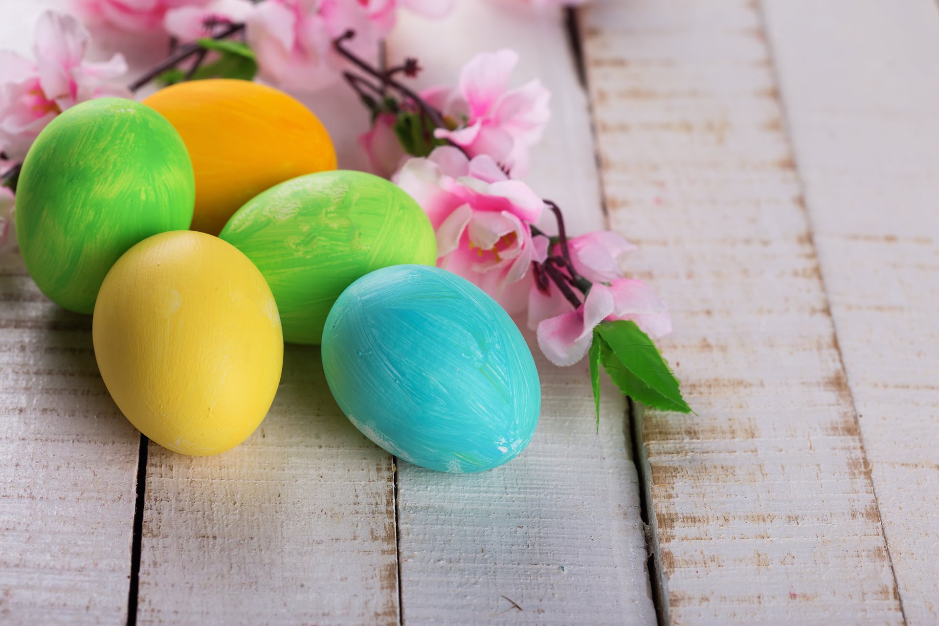 An Easter egg in a basket. Beautiful flowers. Colorful eggs on the table