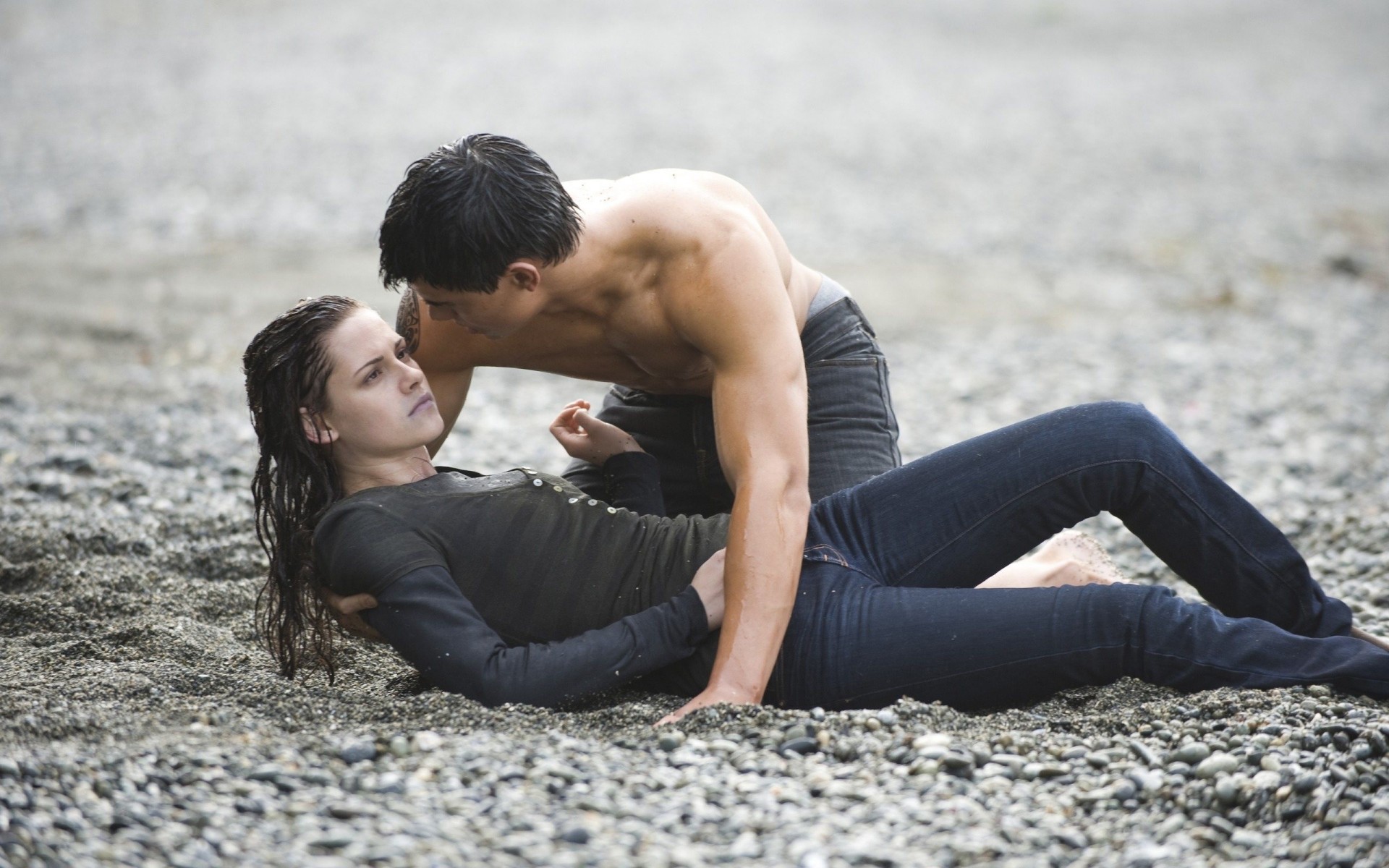 The werewolf from twilight grins and looks from under his brows