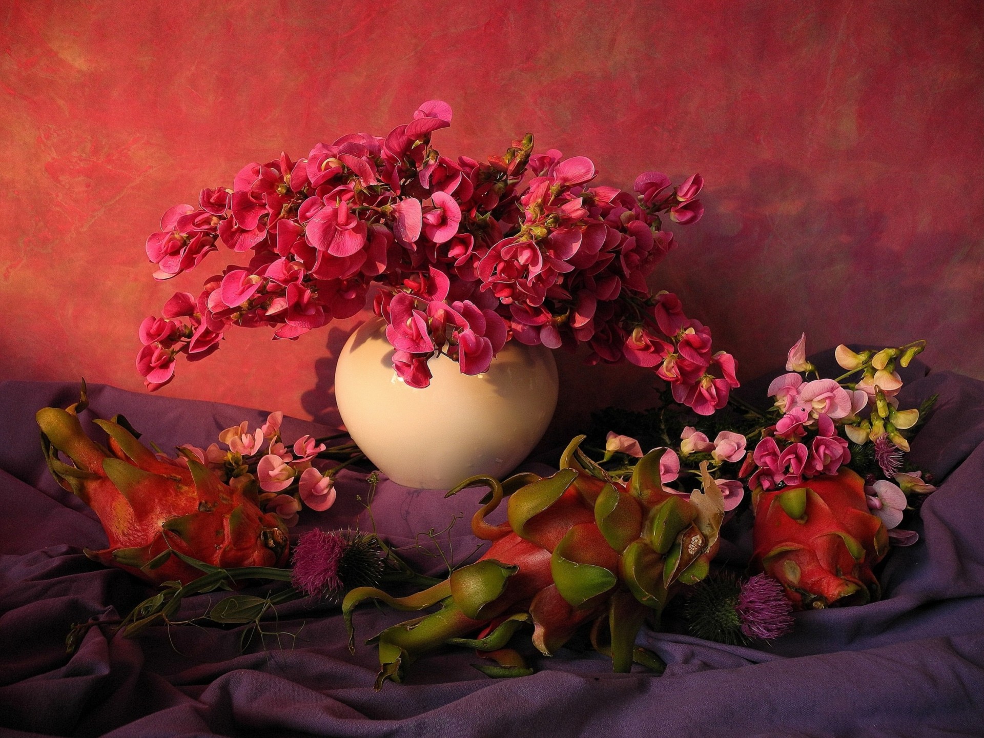 Still life with fruits and flowers on a red background
