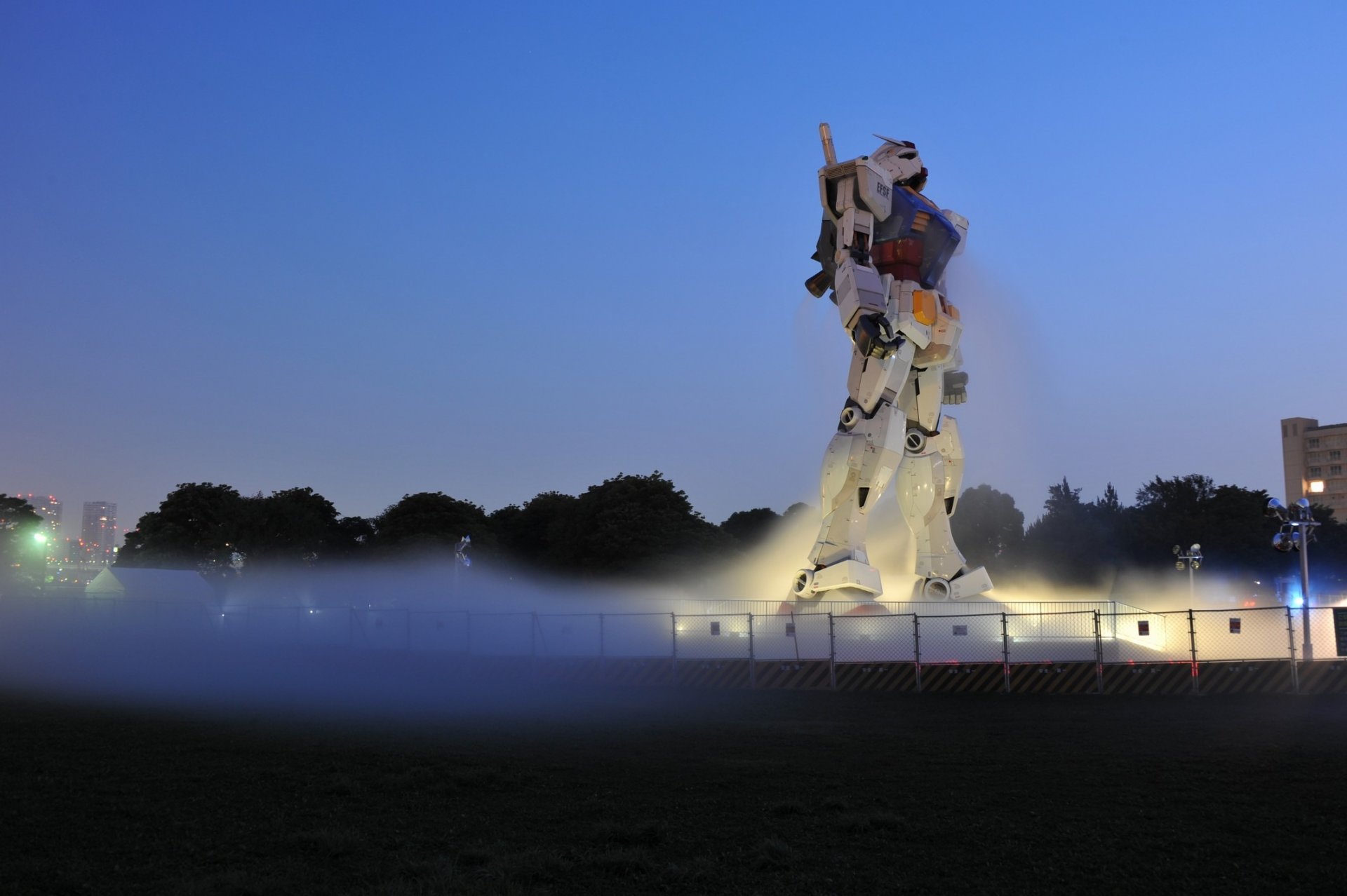 A big robot on the background of a blue sunset