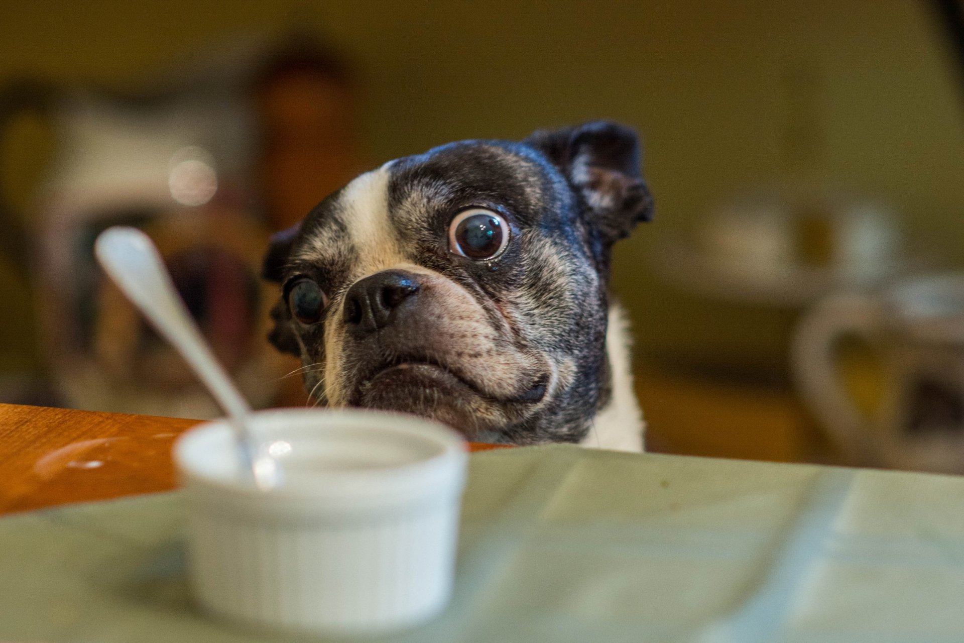 Petting the dog sits and looks at the rain , and there is an umbrella next to it