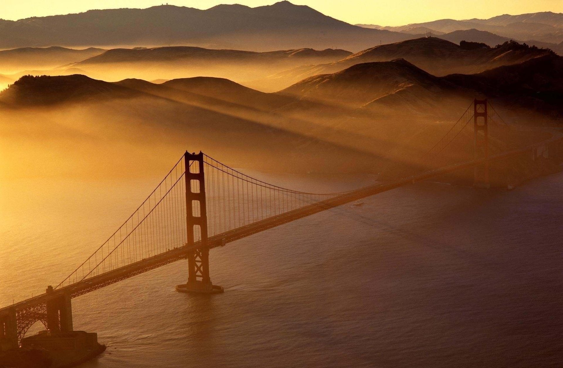 The bridge over the bay unites two shores, beautiful mountains can be seen in the fog