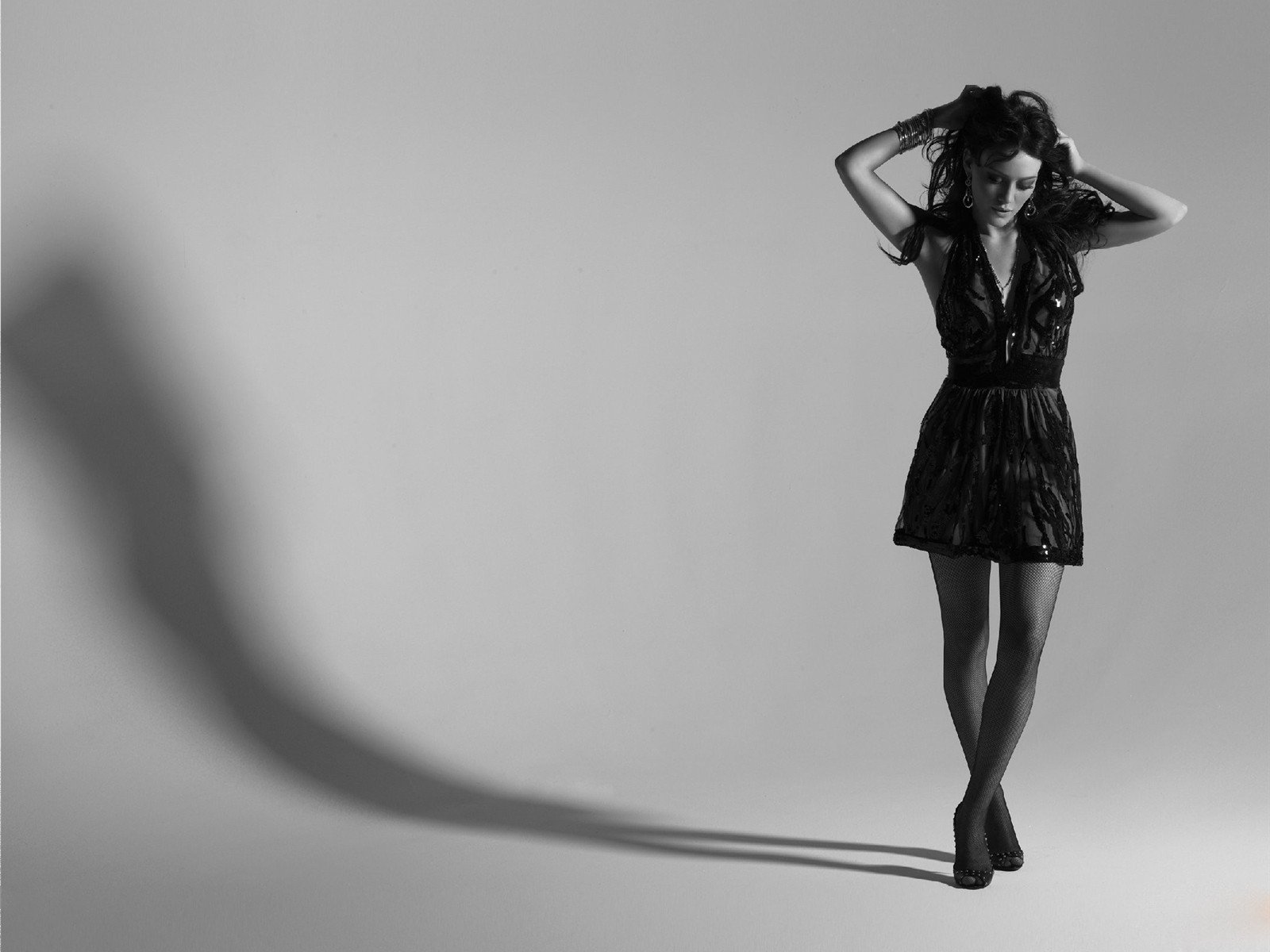 A beautiful girl in a black dress, heels and with pistols in her hands