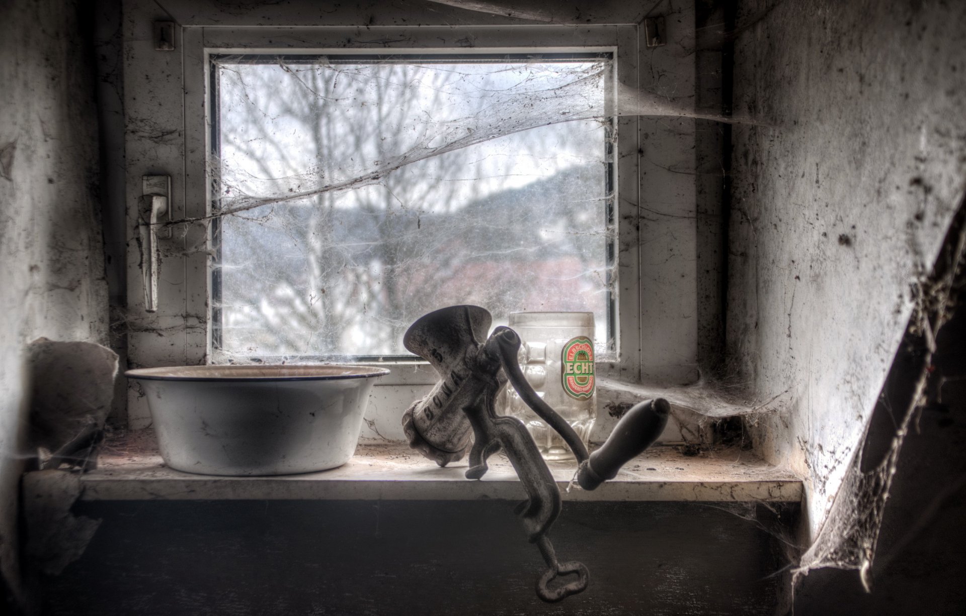 A meat grinder in the form of a photo apparatus on the background of a wall