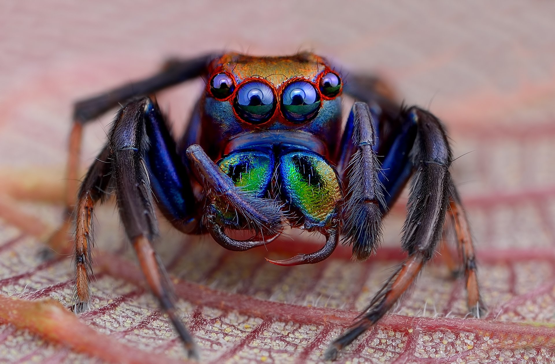 A girl's eye against a background of green skin with cobwebs and spiders on it