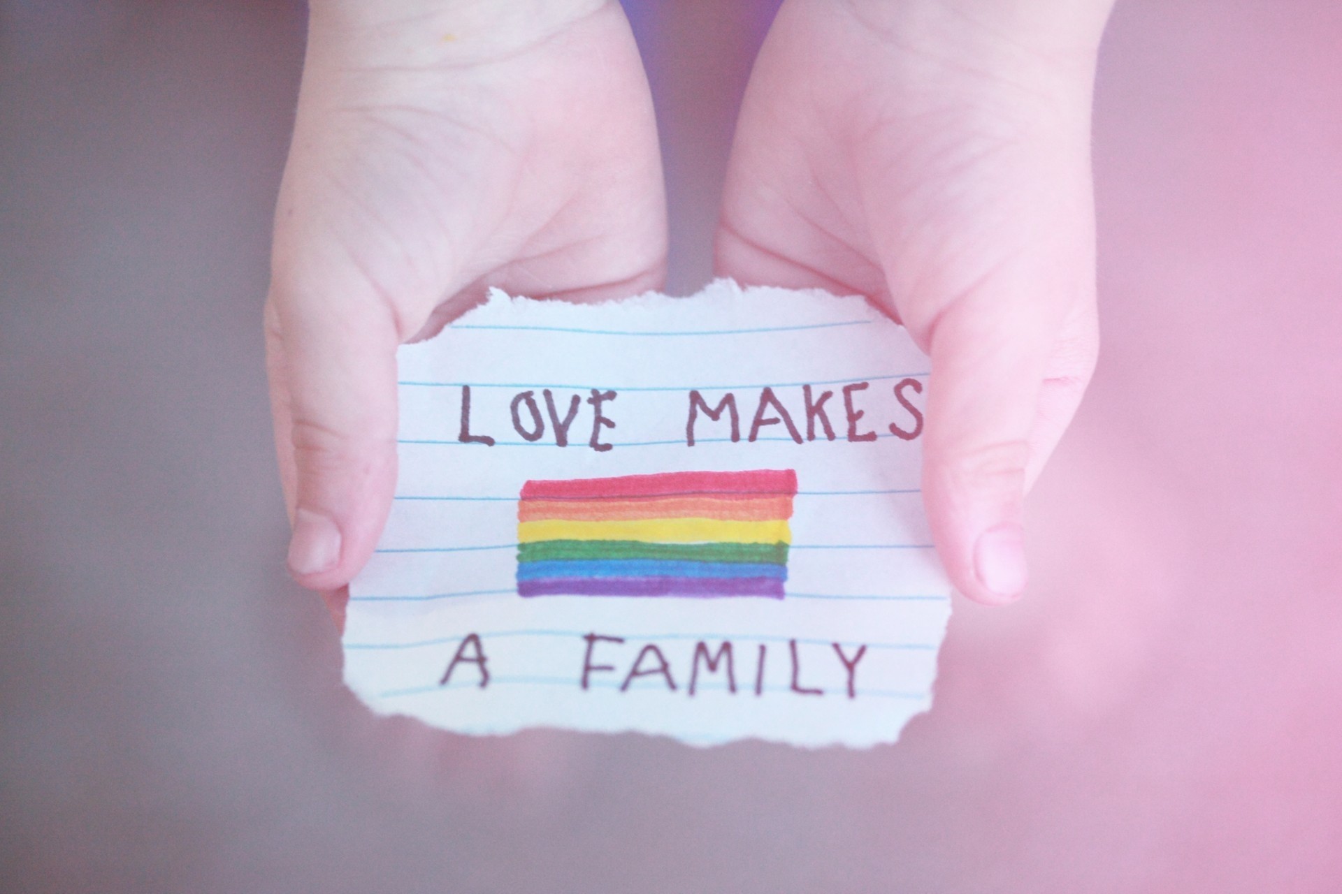 Drawing of a rainbow on a piece of paper with an inscription in the hands of a child
