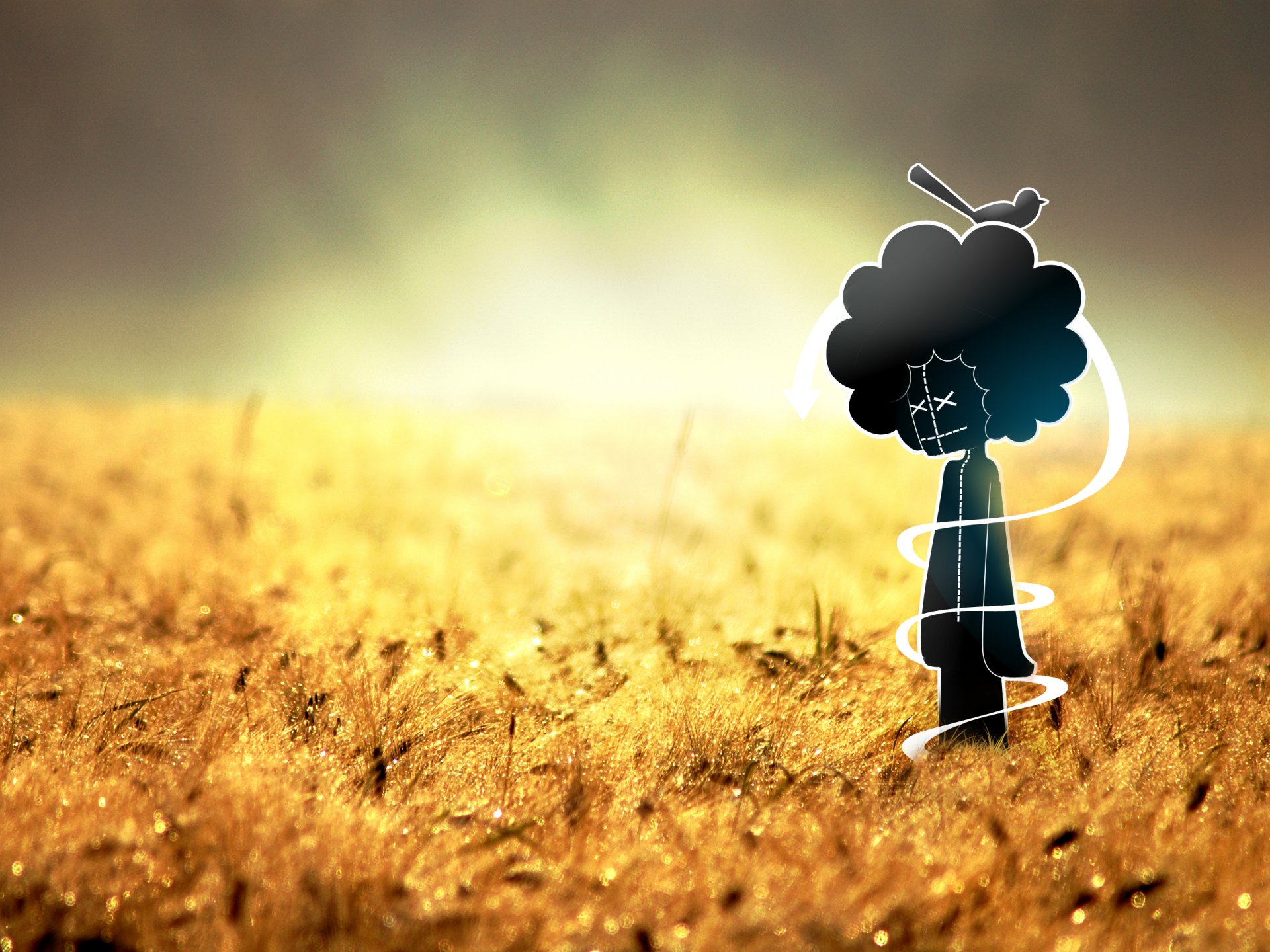 A cartoon man with an afro hairstyle and a bird on his head standing in a golden field