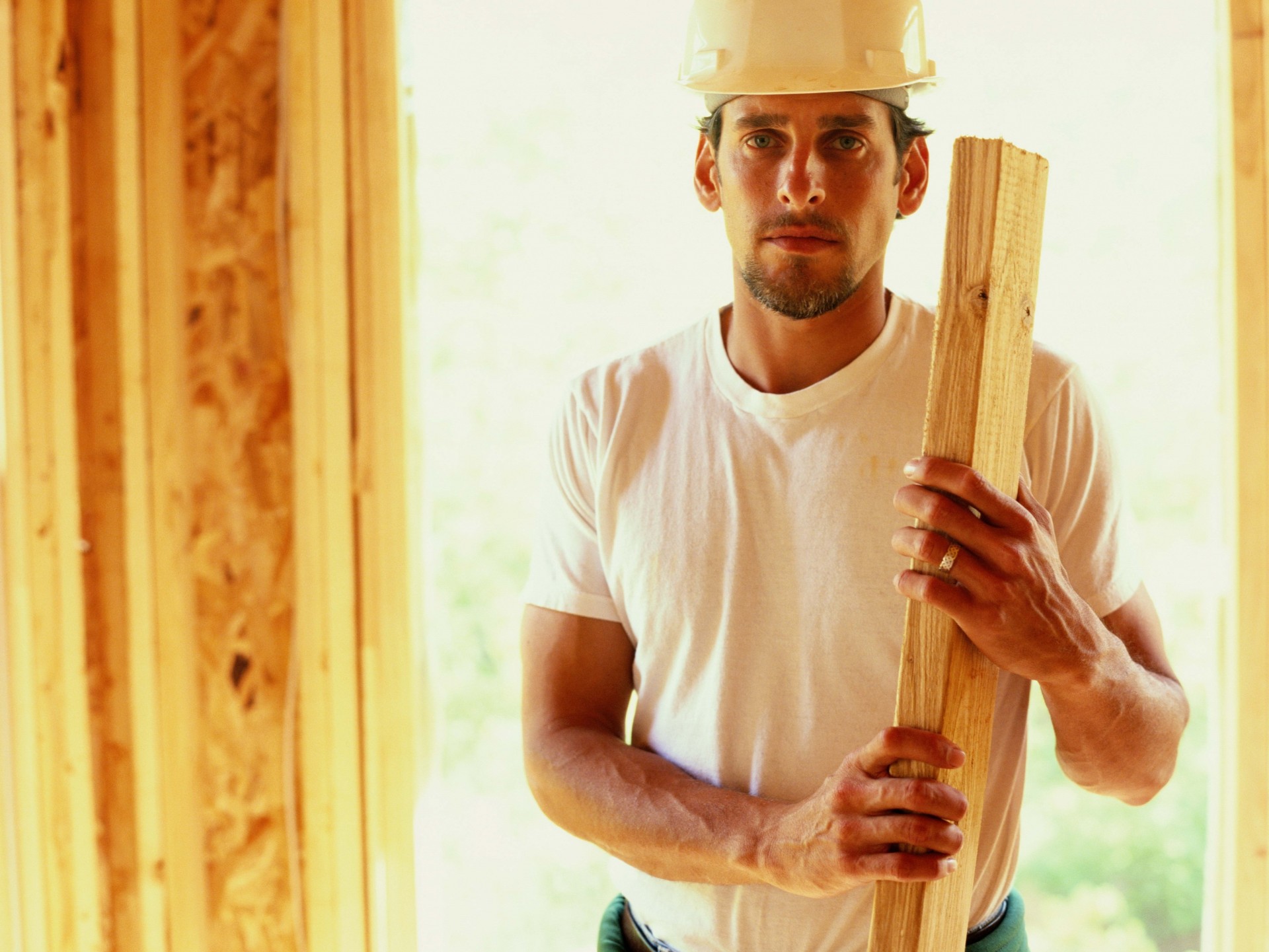 Four men in the stands are holding blue T-shirts in their hands, another man is standing over them