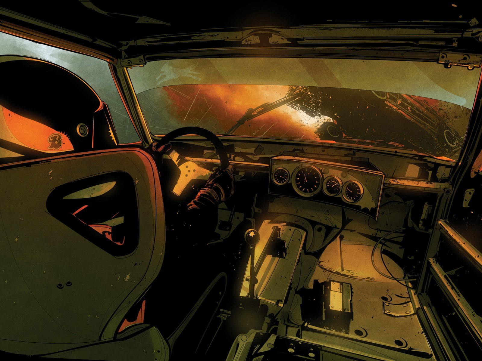 The device of a racing car from the inside in the cockpit recognizes me by the steering wheel