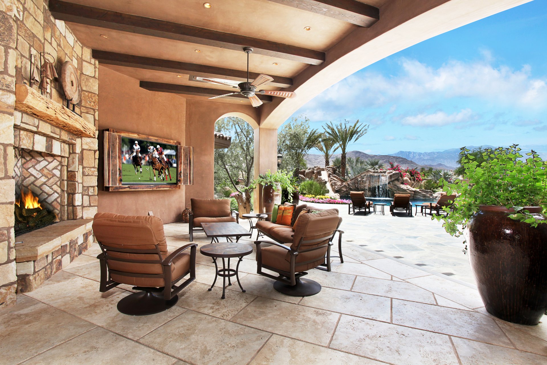 Interior of the living room with fireplace and floor-to-ceiling windows