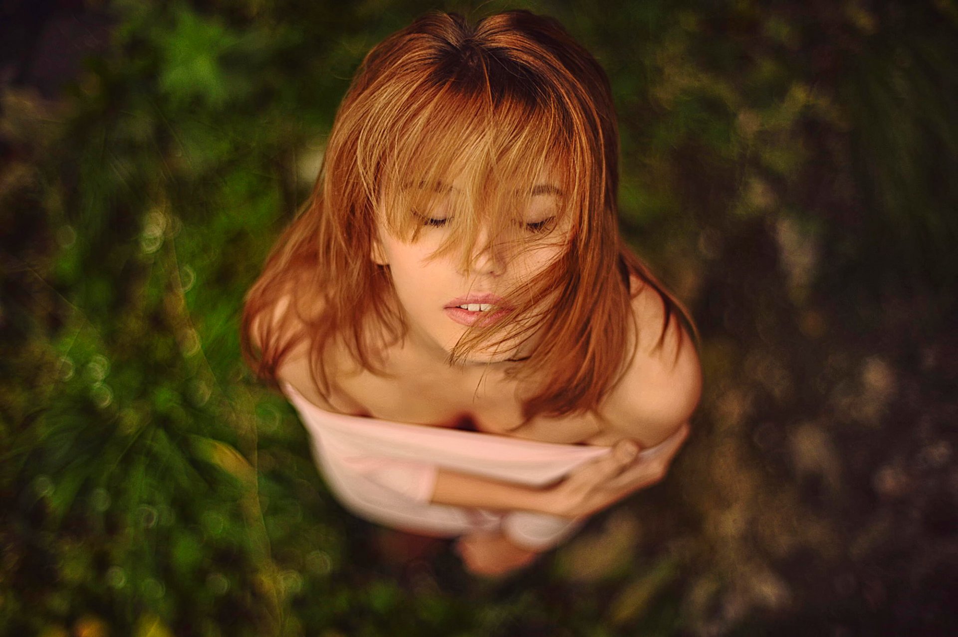 A girl with loose hair and a white blouse in a big black hat on a black background