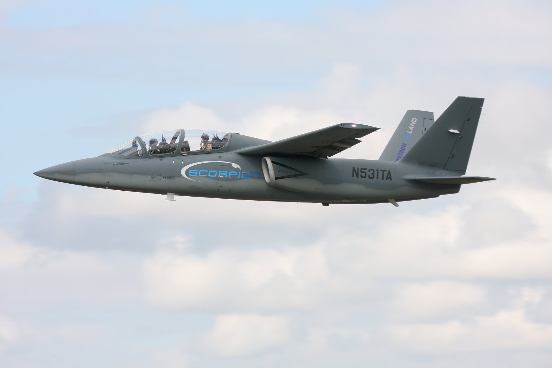 The Scorpion Isr attack aircraft flies in the sky against the background of clouds