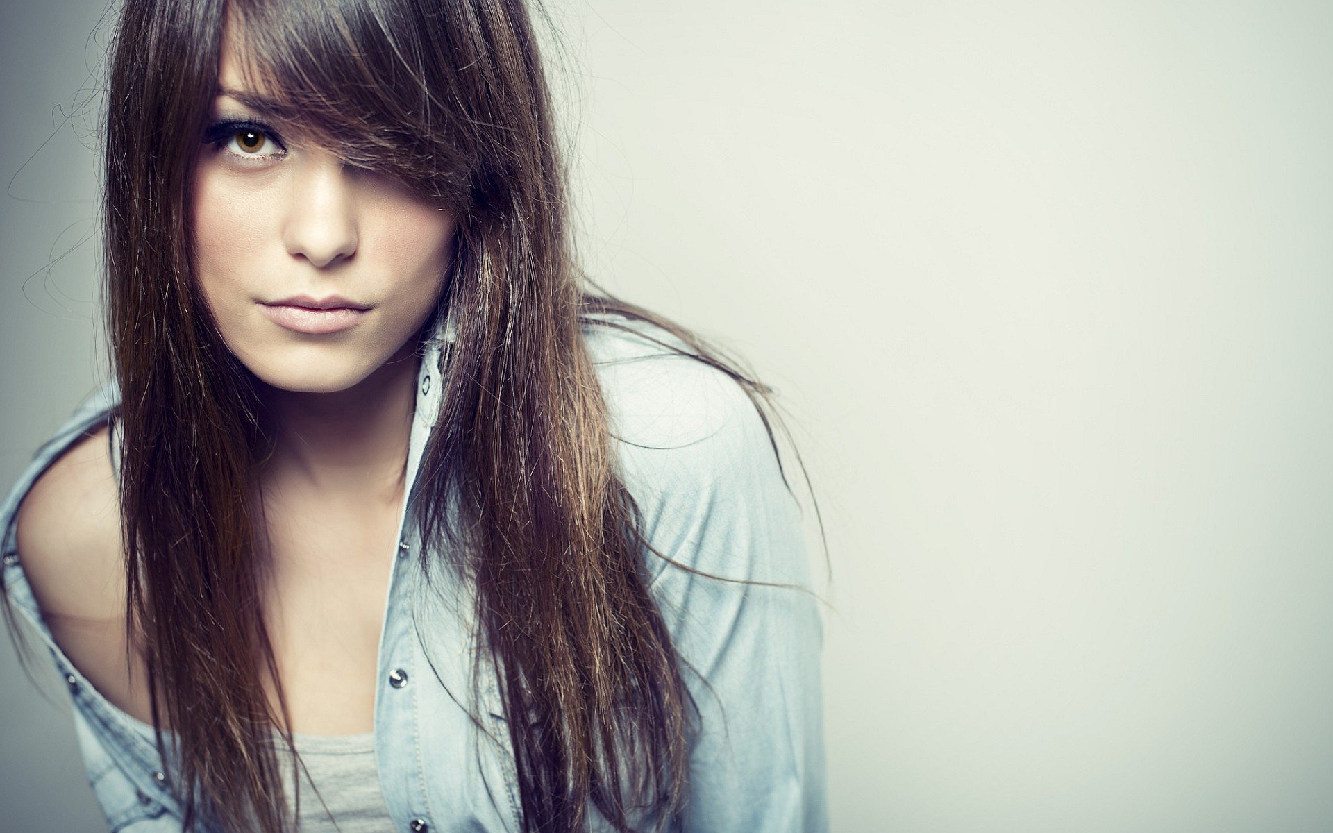 A girl with long black hair in a T-shirt and shirt on a monochrome background