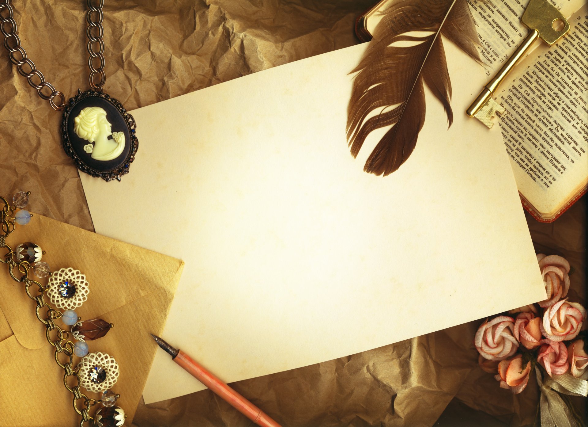 A blank sheet of white paper, a book, a pen, a cameo and a key