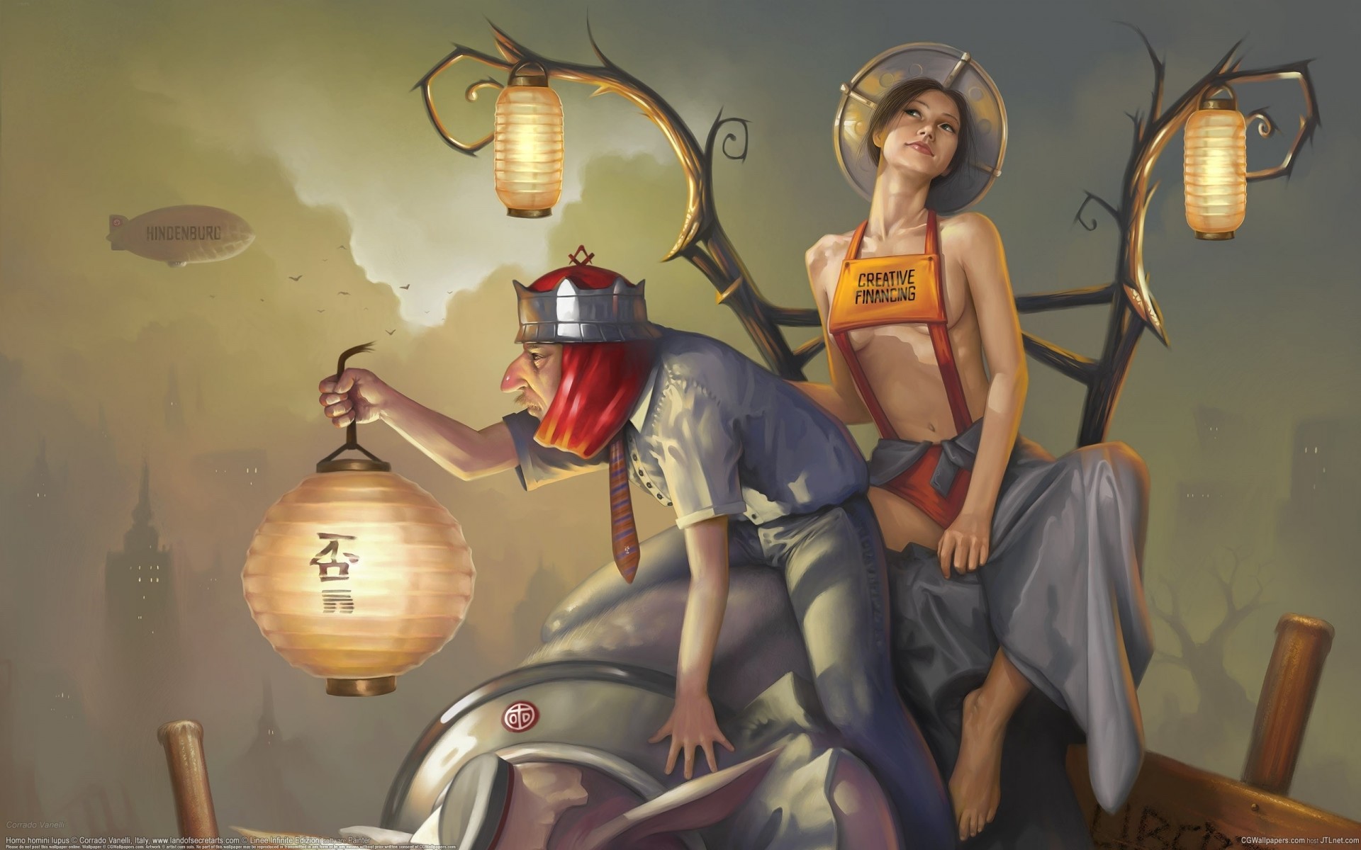A hawk-nosed man in a burqa and a crown with a Chinese lantern lights the way for a proud and brave dreamy girl in a hat