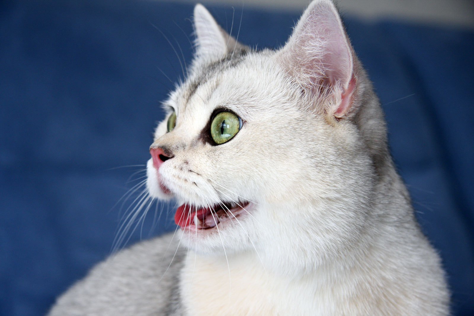 A white cat with different eyes and an open mouth