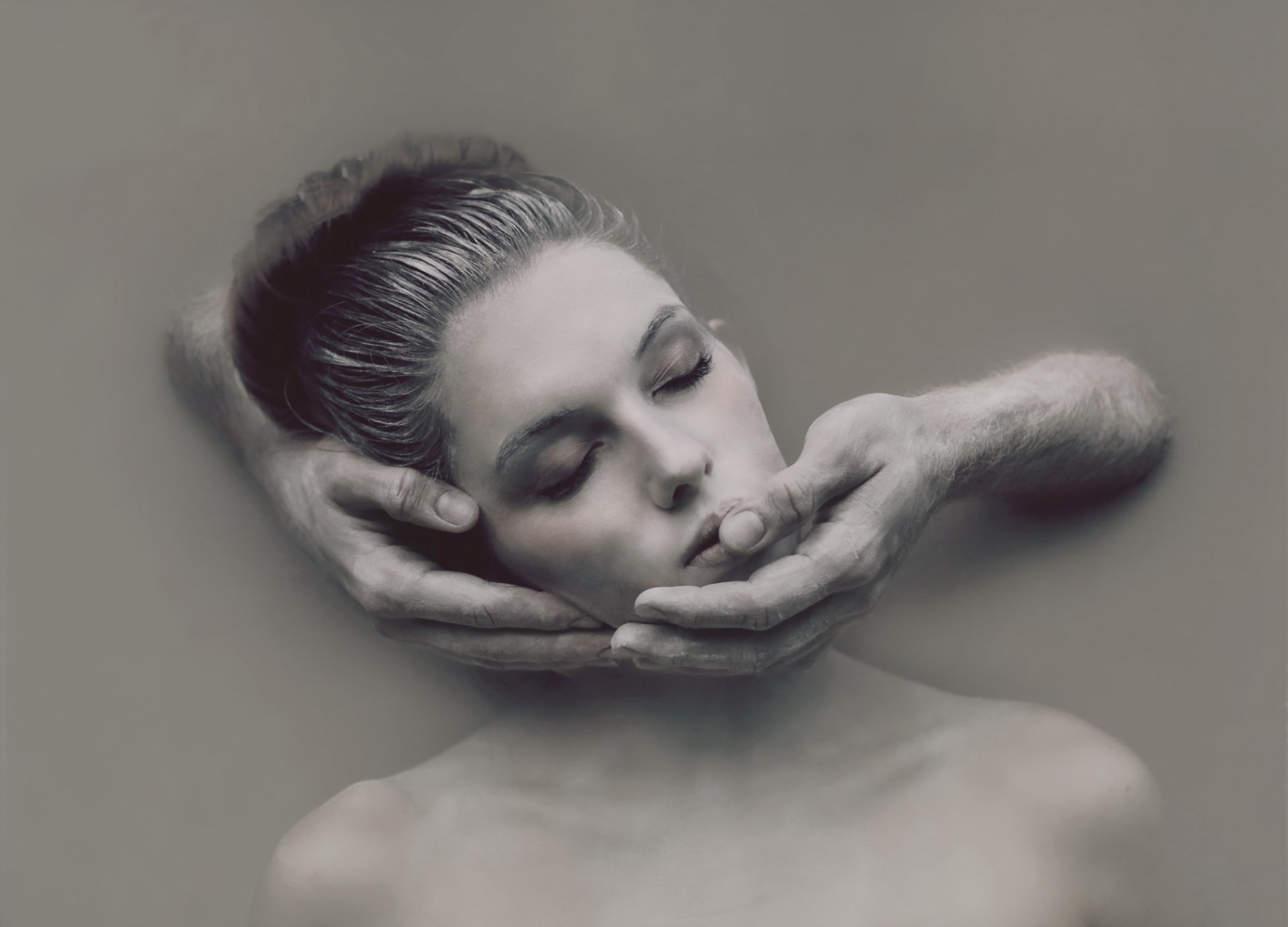 A man supports a woman by the head