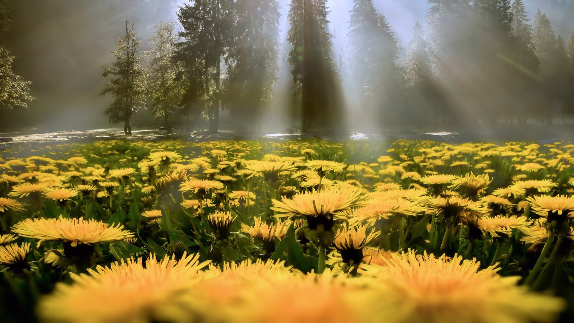 A glade of yellow dandelions meets the rays of the sun from behind dense pines
