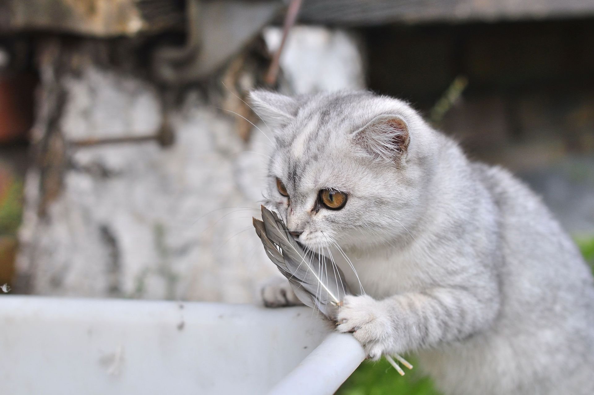 A beautiful white kitten with feathers in its paws