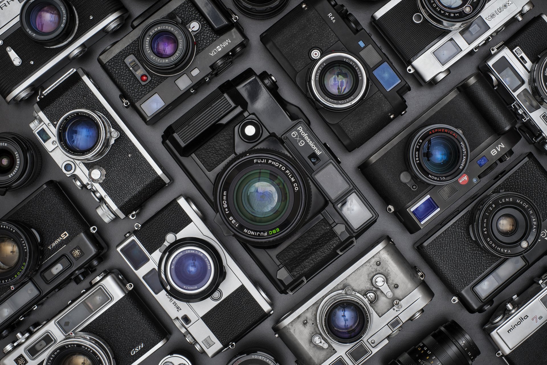 A large number of cameras stacked together in a case