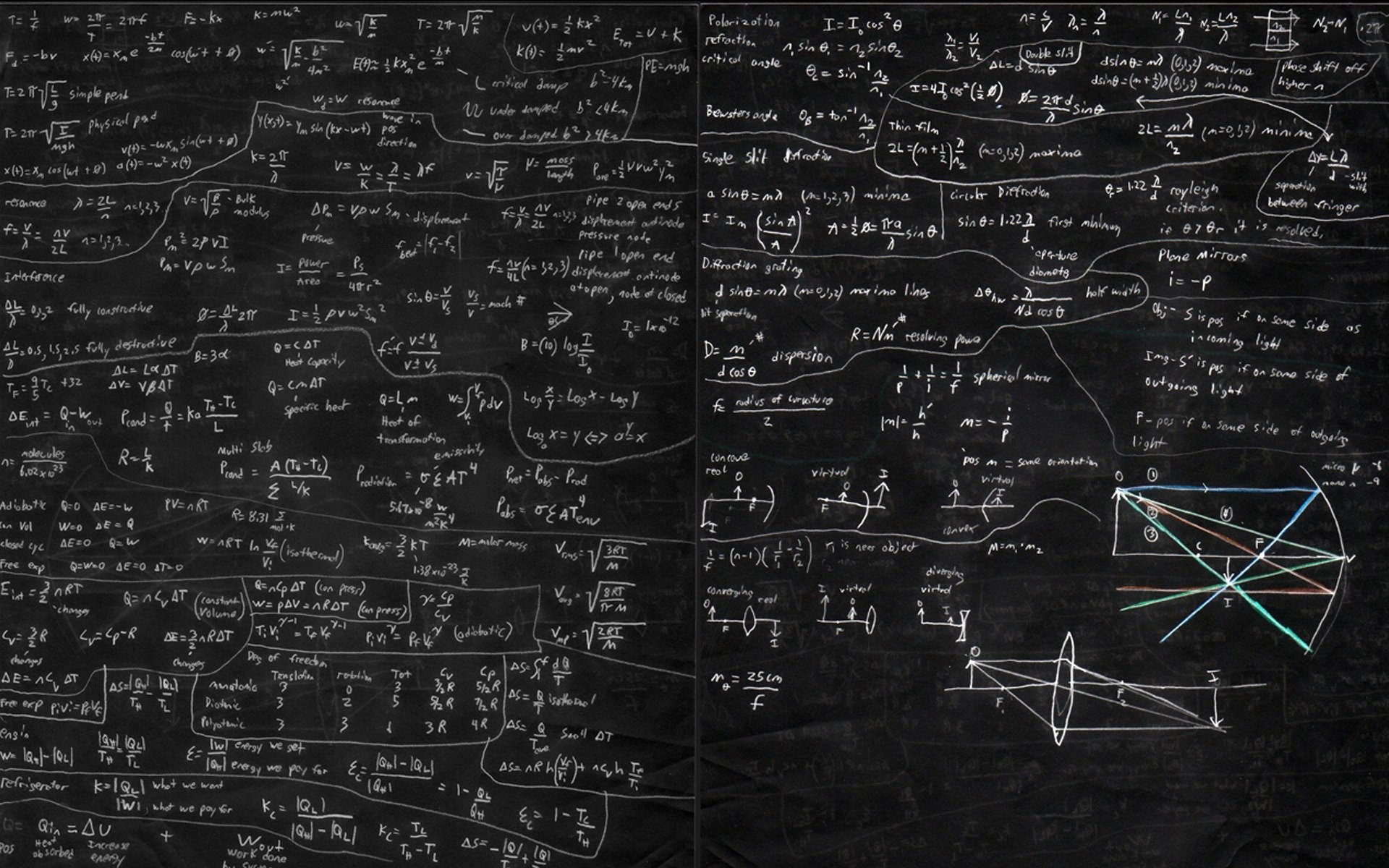 On a dark gray blackboard, many mathematical formulas are written in chalk