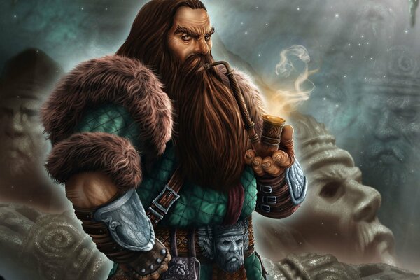 Fantastic art is drawn by an old magician sorcerer holding a pipe in his mouth, well-read magic books with a scroll