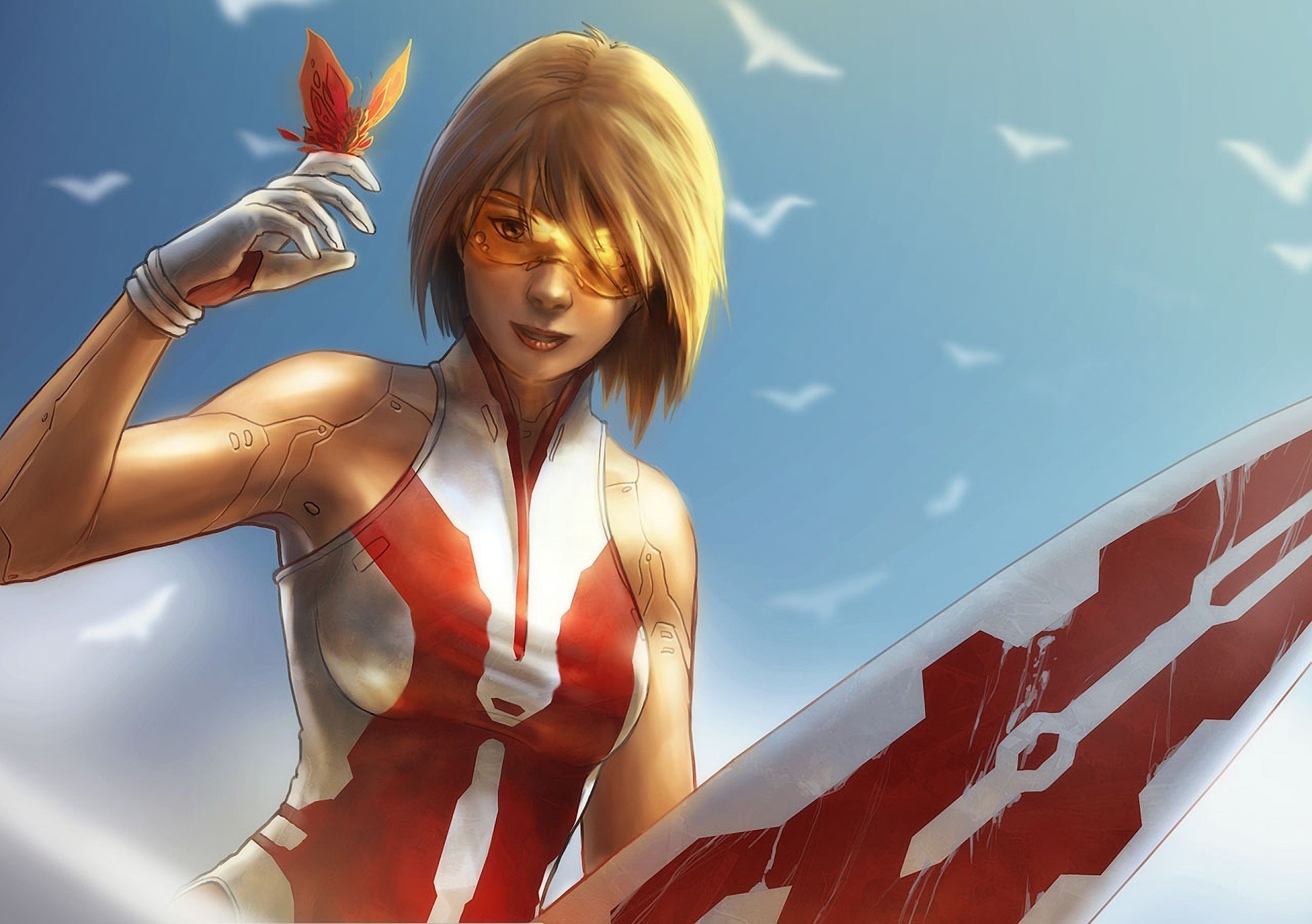 Girl with a butterfly and a surfboard