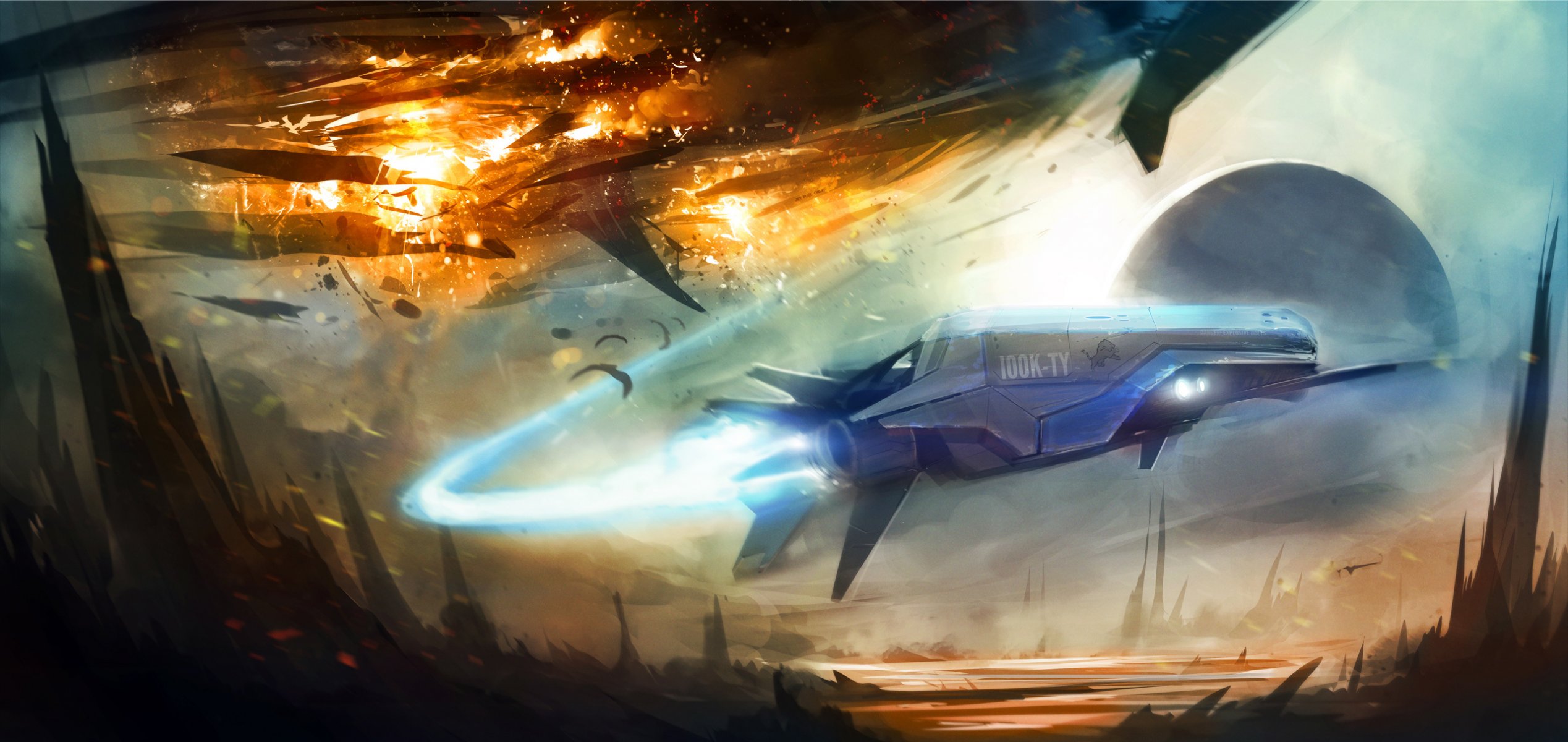 Art of the battle of spaceships against the background of dark mountains and blue planets