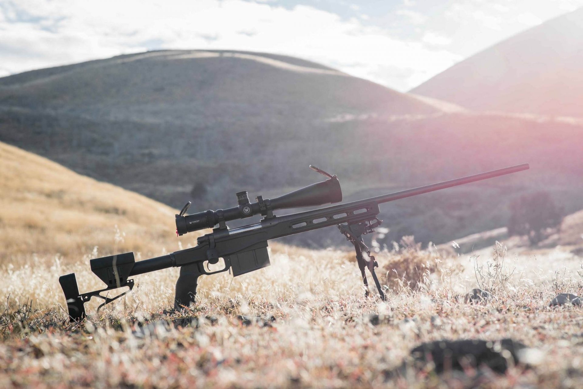 Sniper rifle on a mountain background