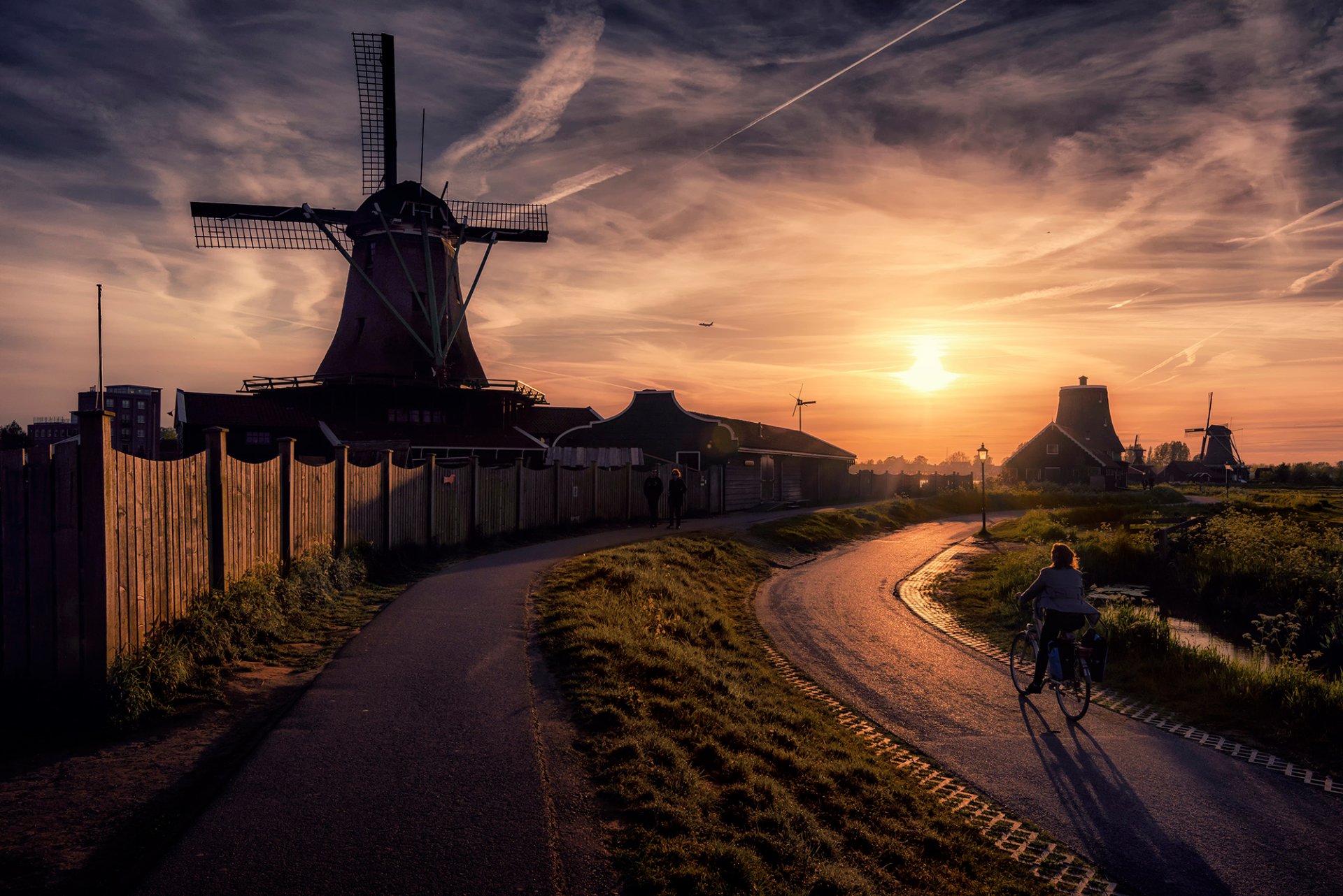 A man rides a bicycle near a mill