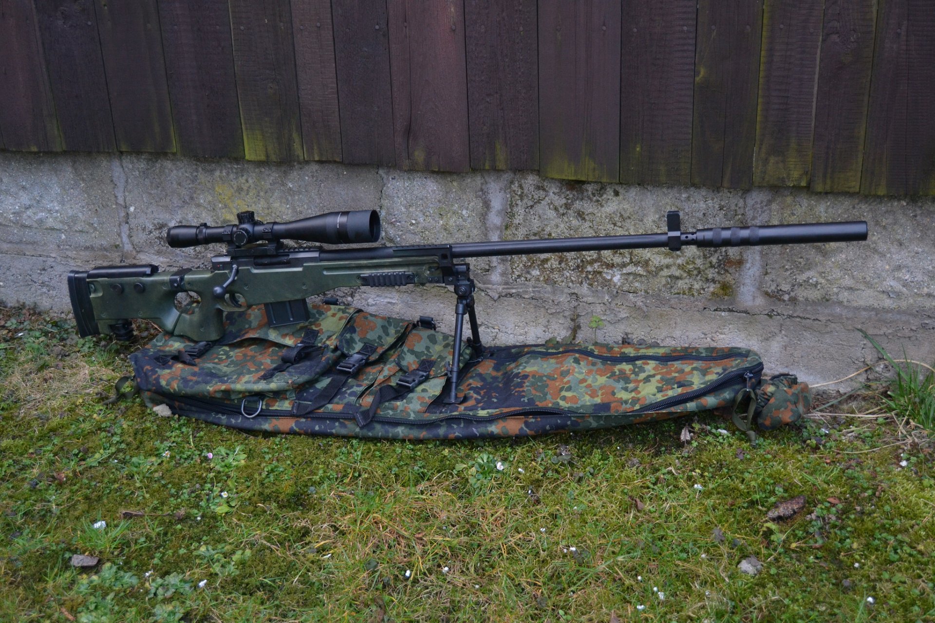 Sniper rifle on camouflage camouflage clothing, full arsenal