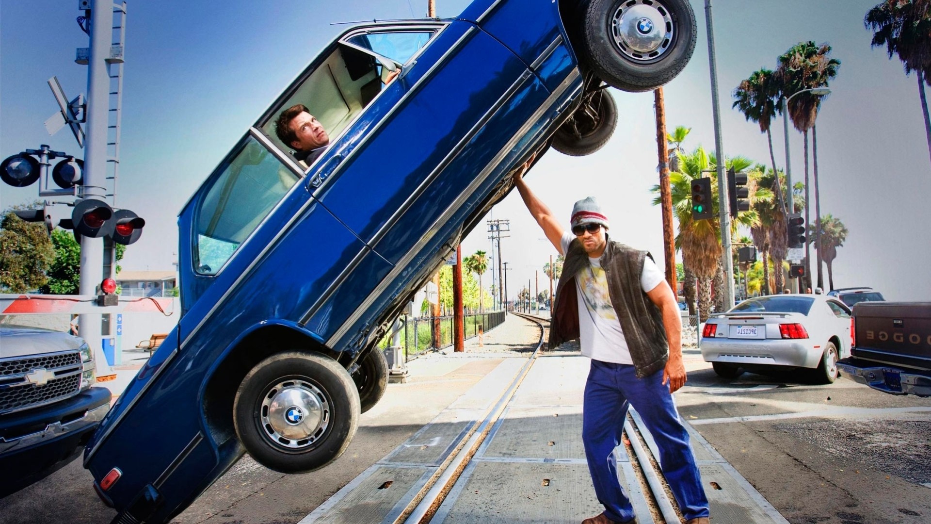 A shot from the movie with Will Smith with a car