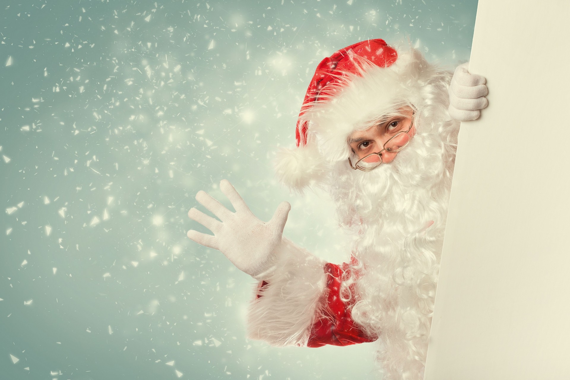 Christmas tree with a star and a wish for a happy New year on the background of Santa Claus in a reindeer cart