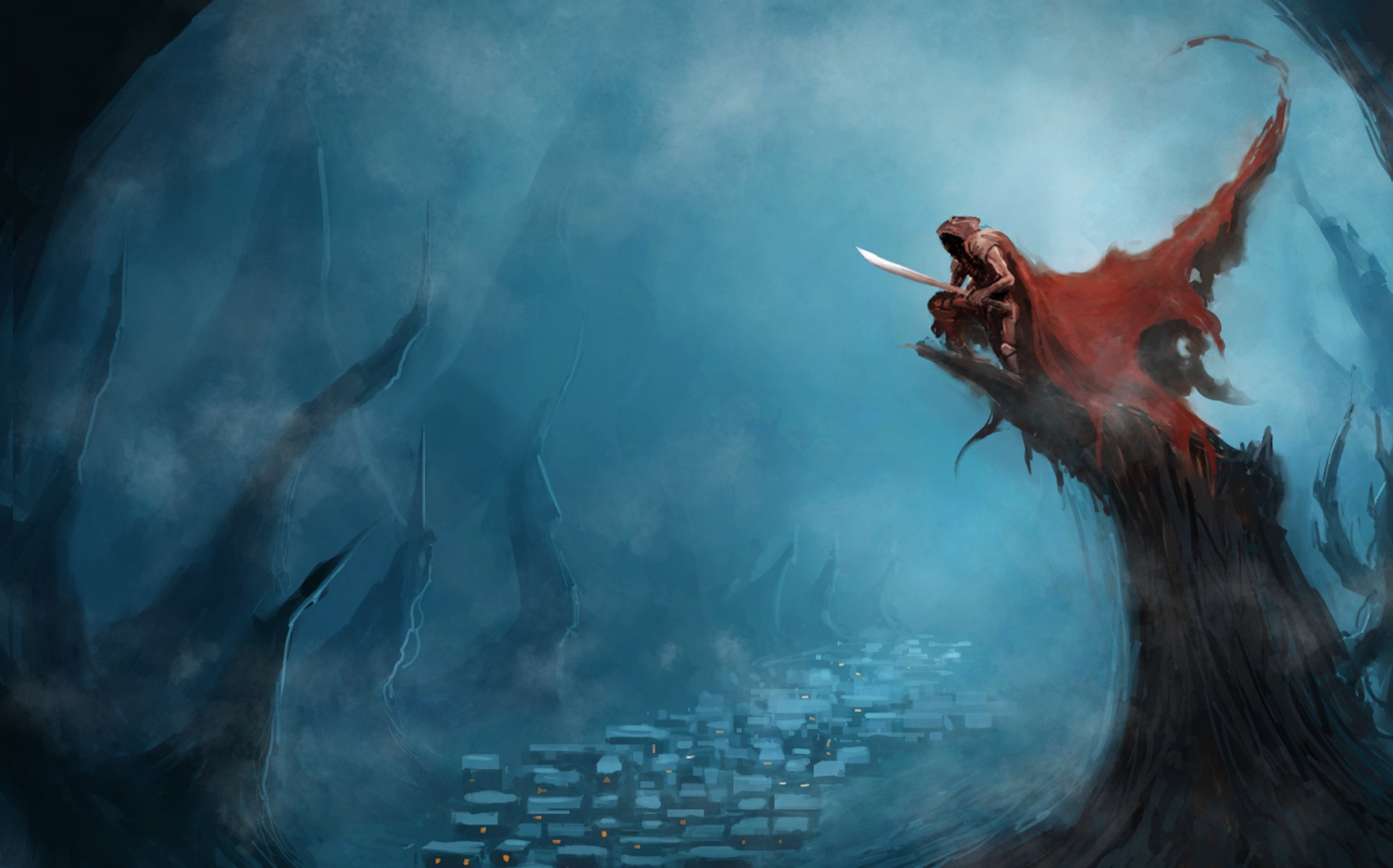 A warrior in iron armor with a sword and shield on the background of a misty forest