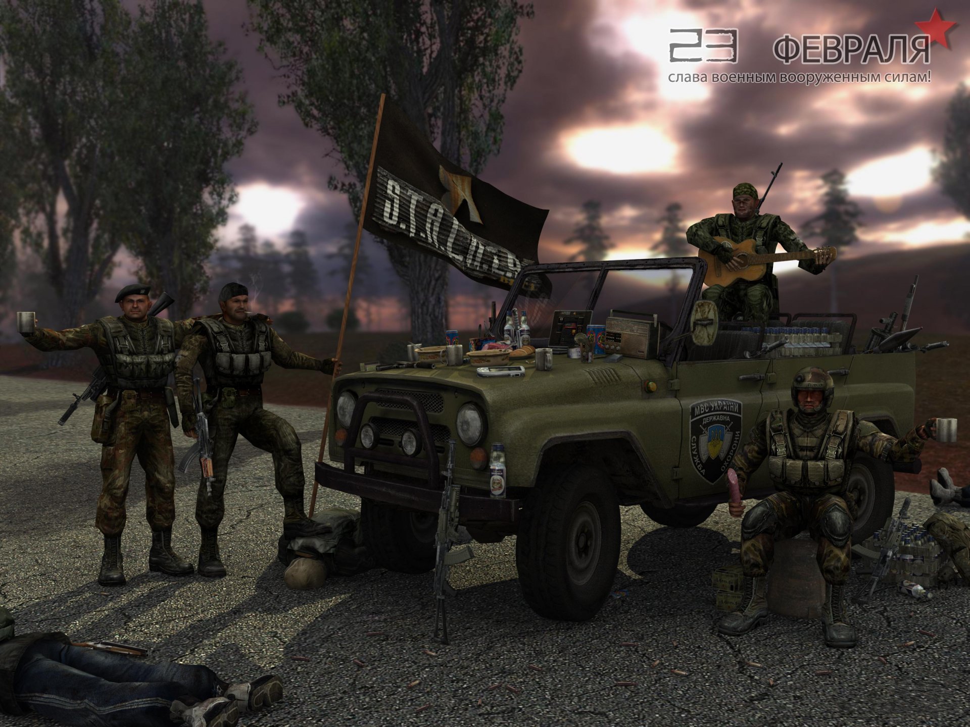 Soldiers in camouflage are standing by the car holding a flag