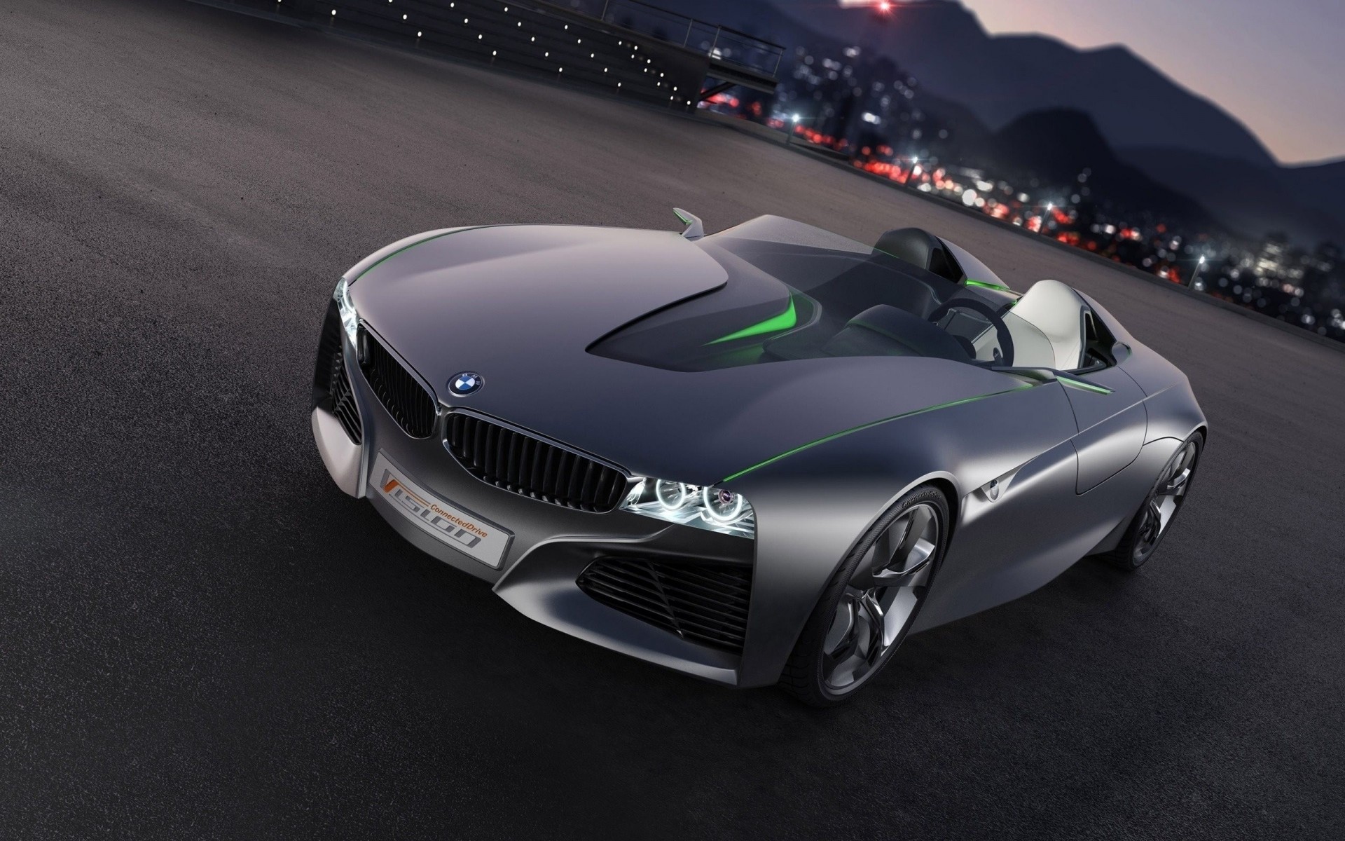 The car is black against the background of night lights