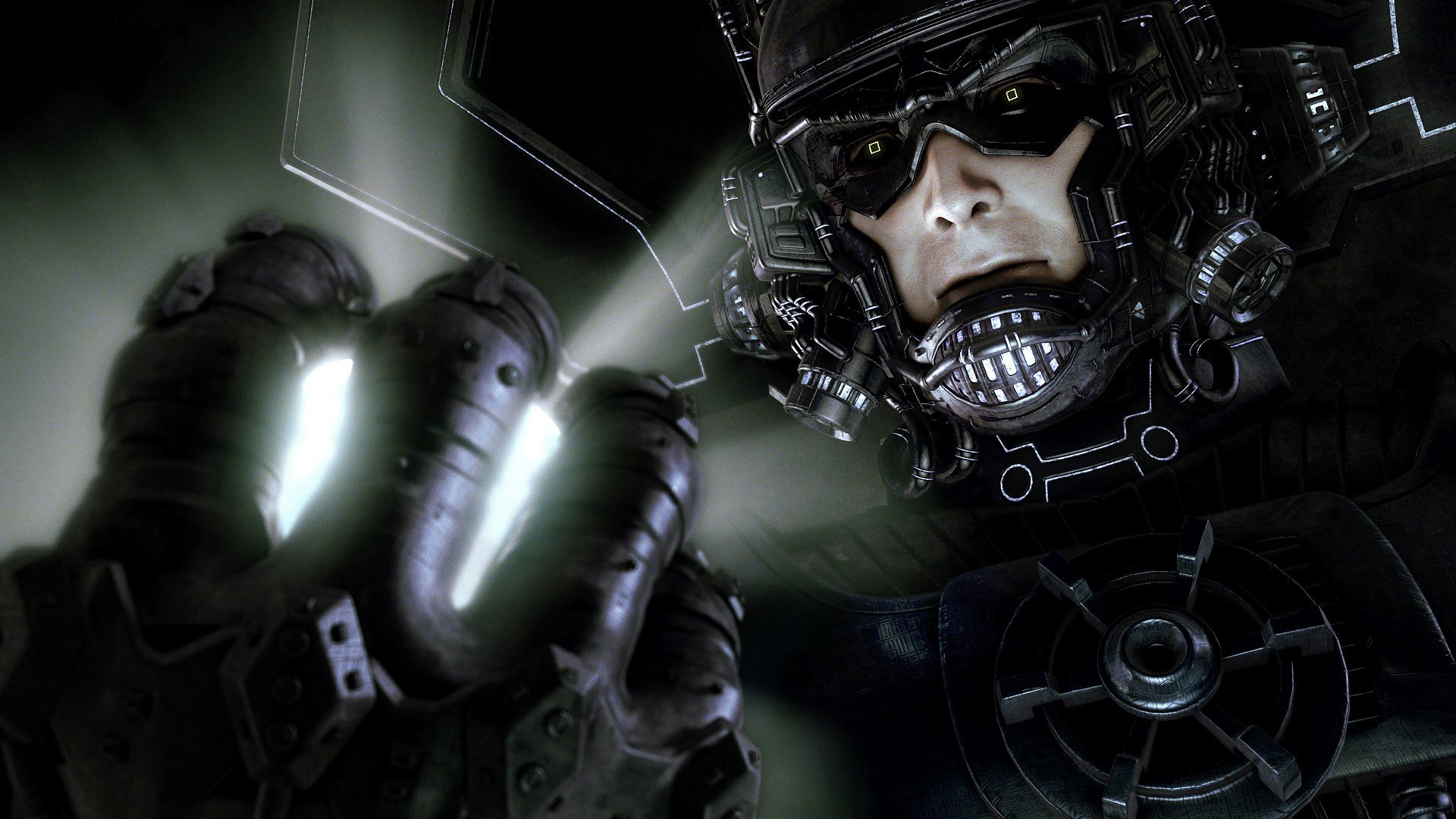 A guy in a black helmet with a light from his hand