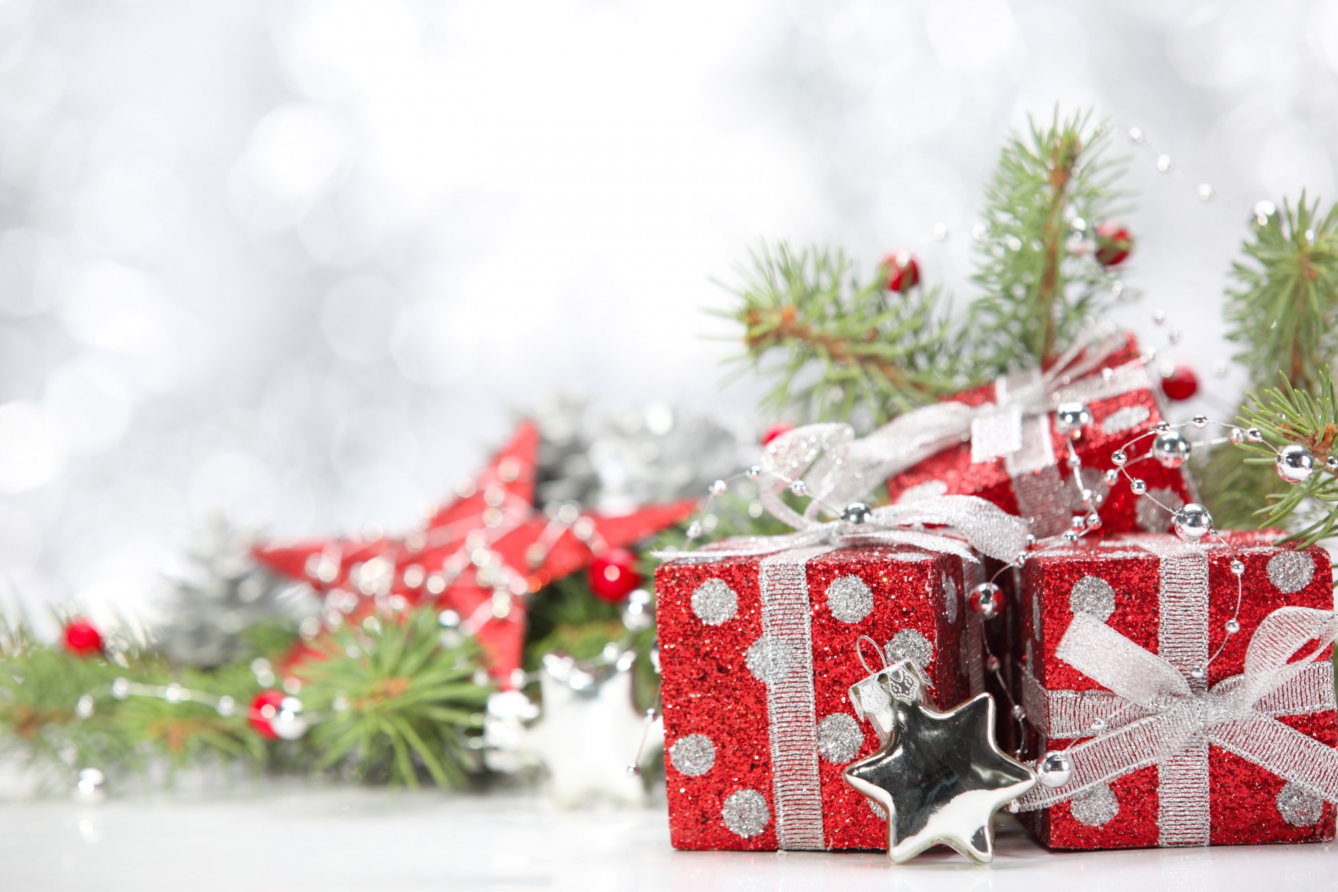 A Christmas gift in a golden box with a ribbon. New Year candles on a yellow background