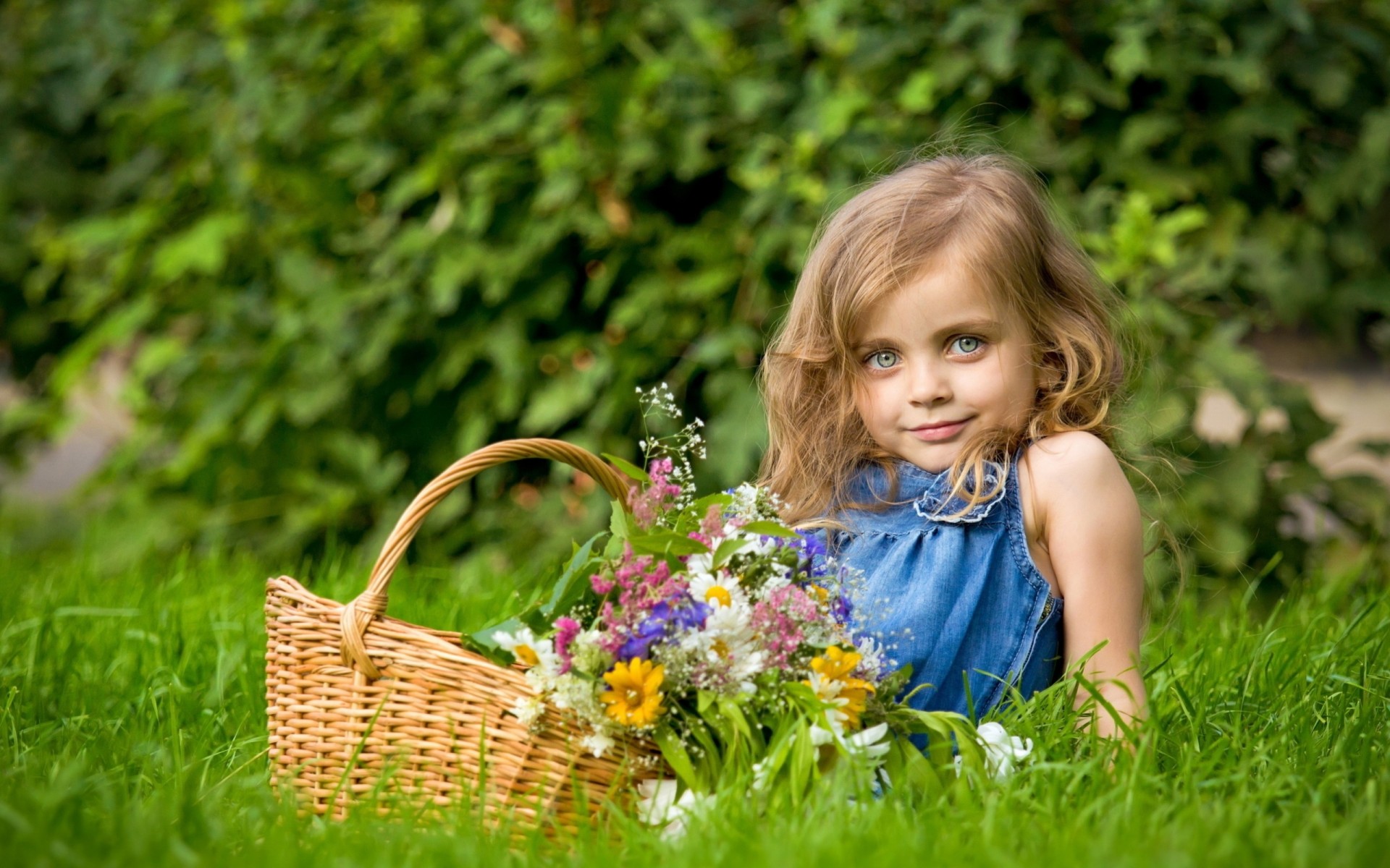 A girl with a basket of meadow flowers on a green lawn