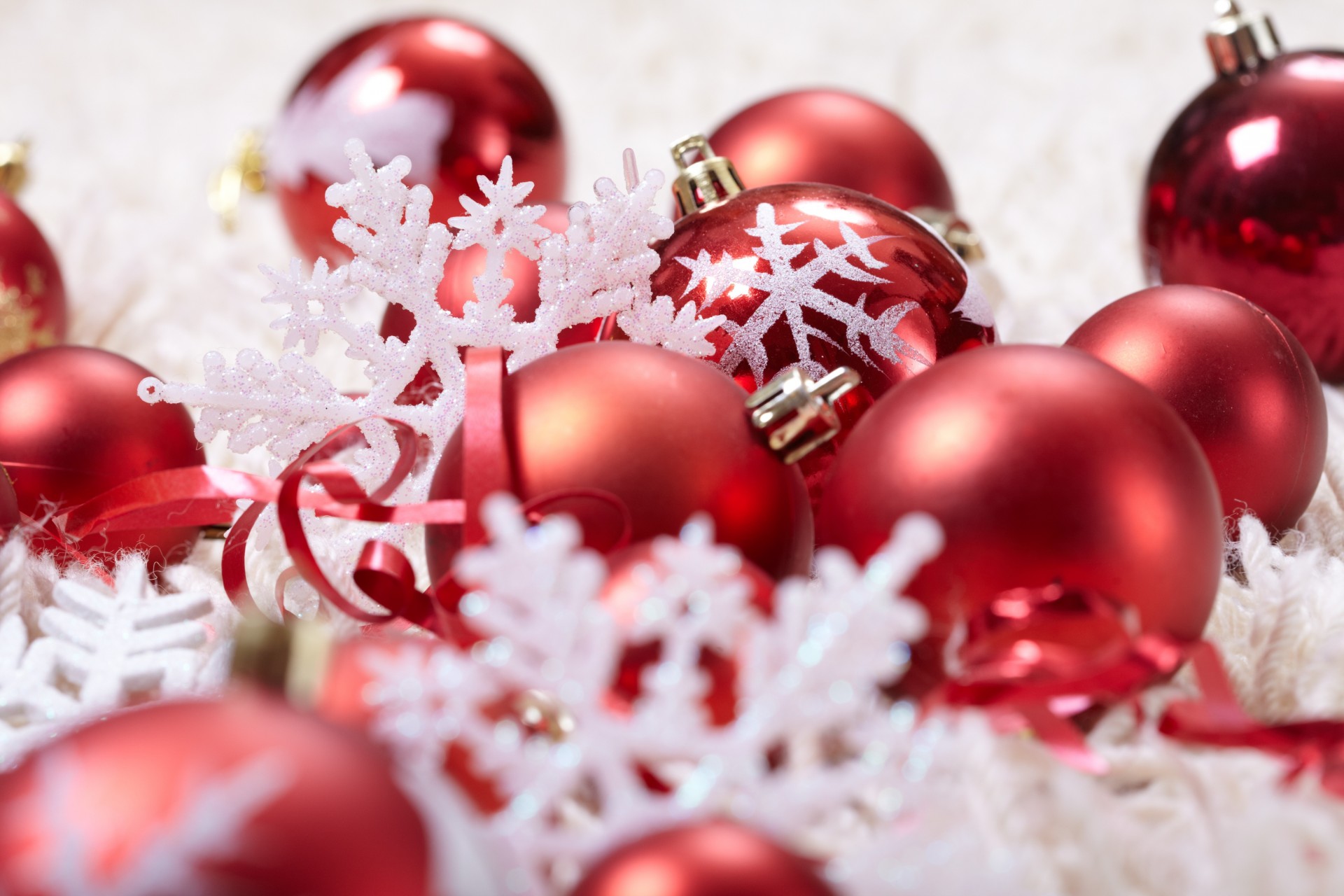 Christmas tree toys , red balls , snowflakes , ribbons